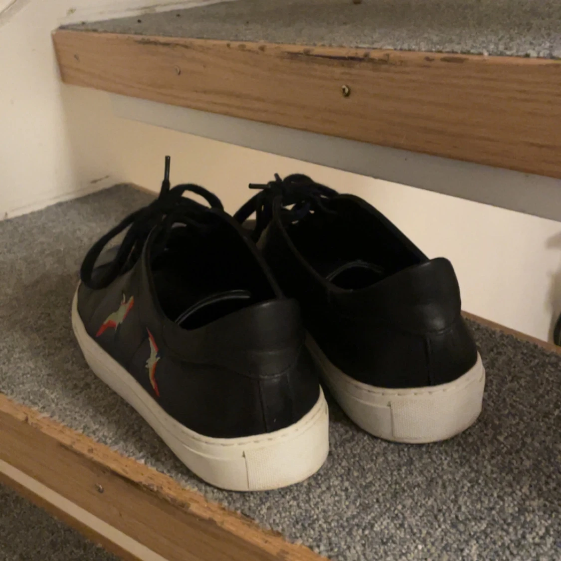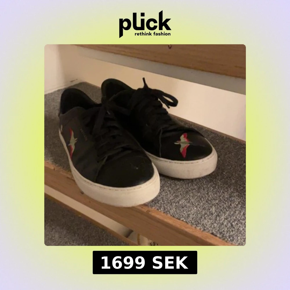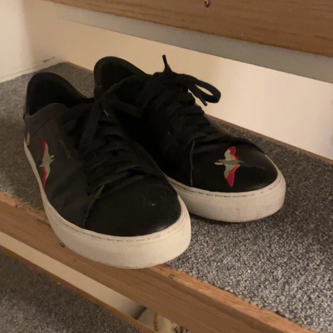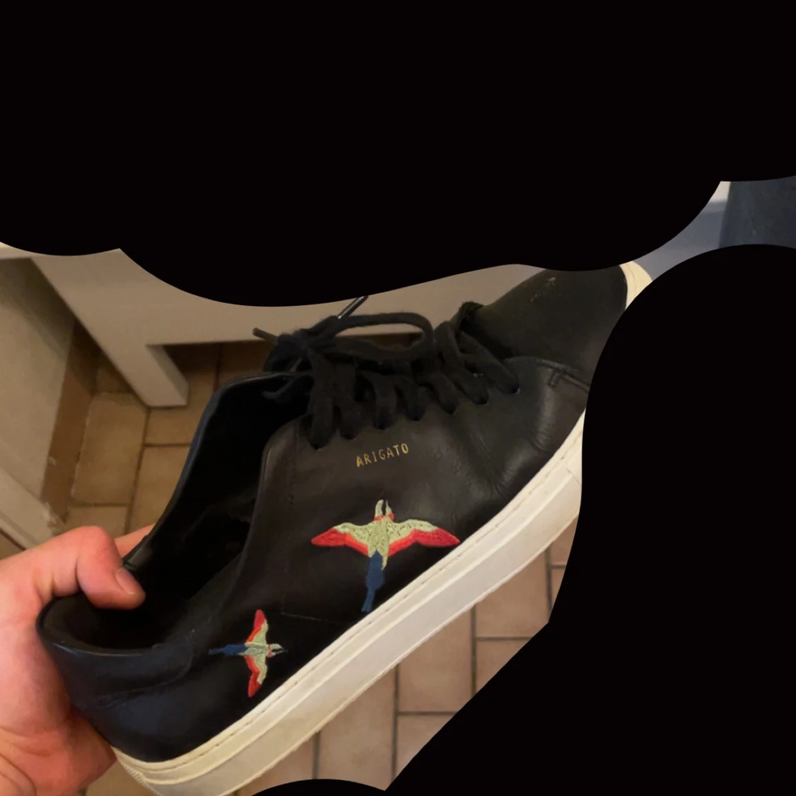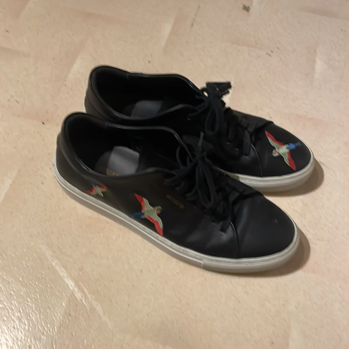 Snygga svarta sneakers från Axel Arigato med färgglatt fågelbroderi på sidorna. Skorna har en vit sula och klassisk snörning. Perfekta nu för sommaren för dig som vill sticka ut lite. Skorna är i riktigt fint skick ingen crease