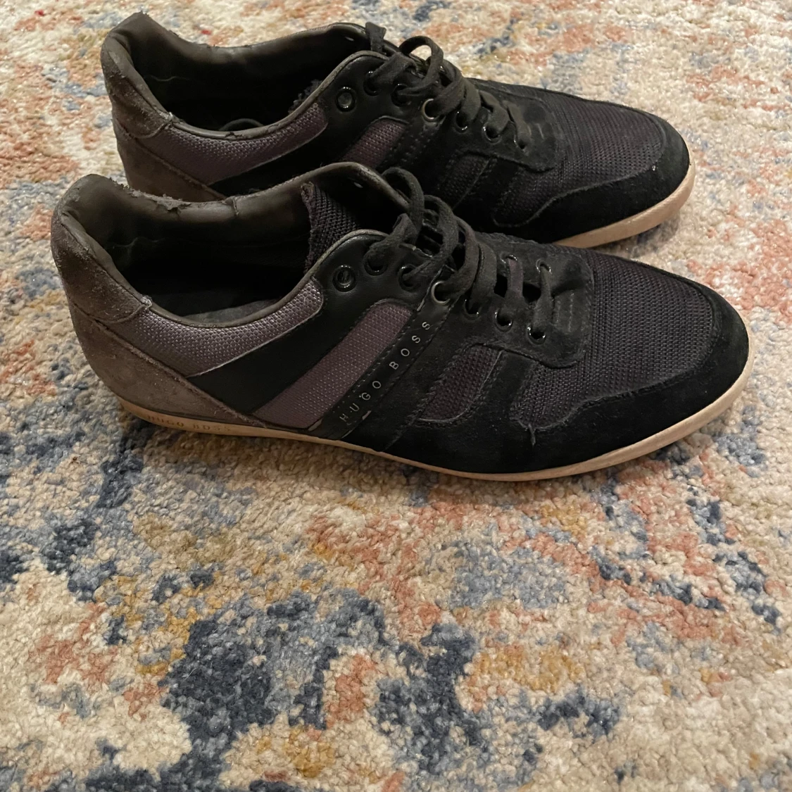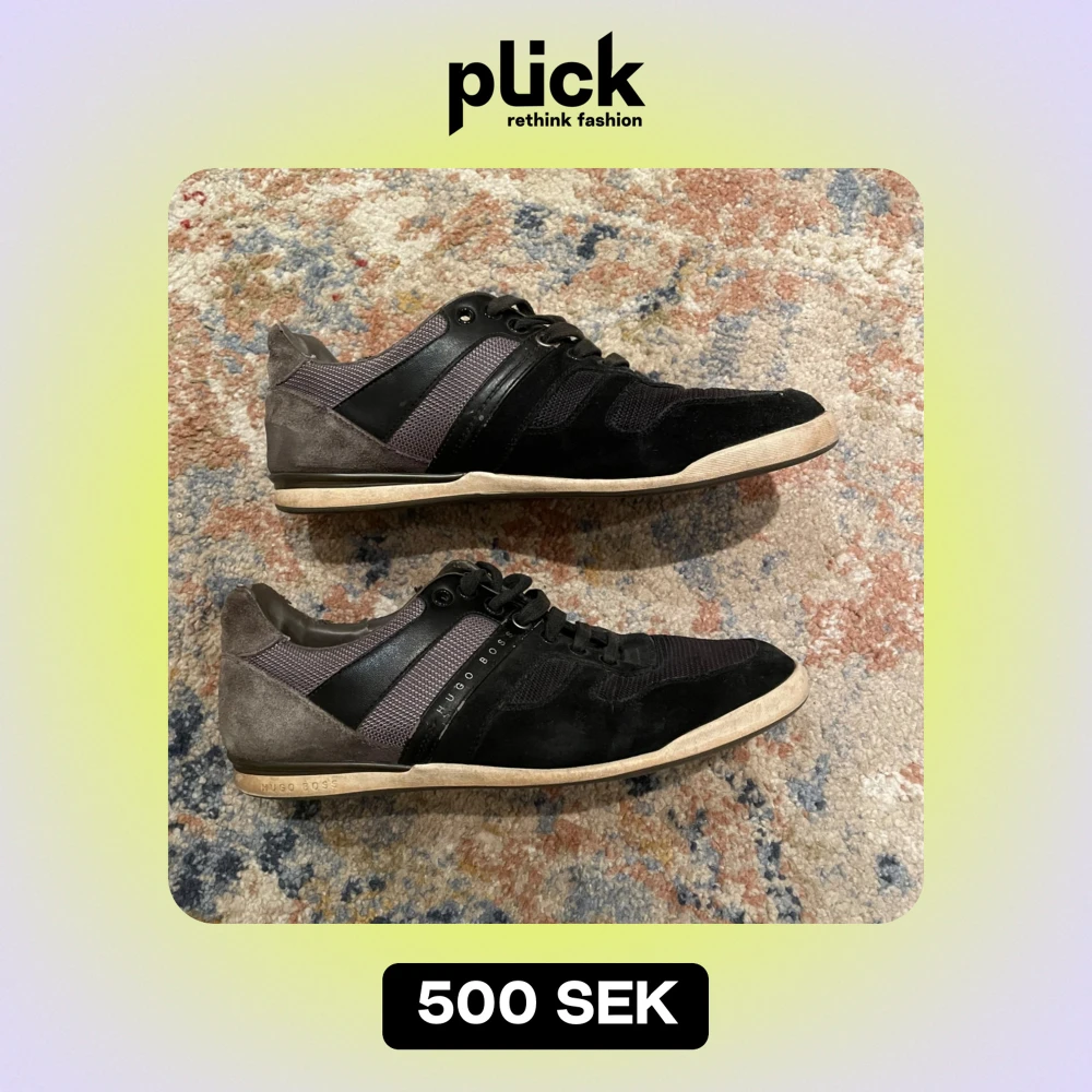 Säljer ett par snygga svarta sneakers från Hugo Boss med grå detaljer, säljer pågrund av dem är för små.