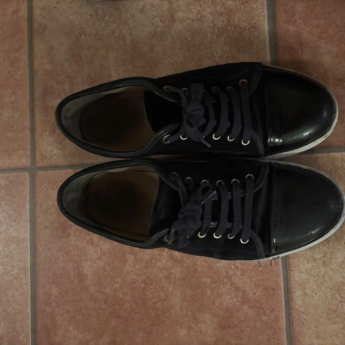 Snygga marinblå sneakers med snörning och vit sula. Skorna har en cool lackad tådel som ger extra edge och resten av skon är i mockaliknande material. Perfekta för dig som gillar en stilren men ändå unik look.