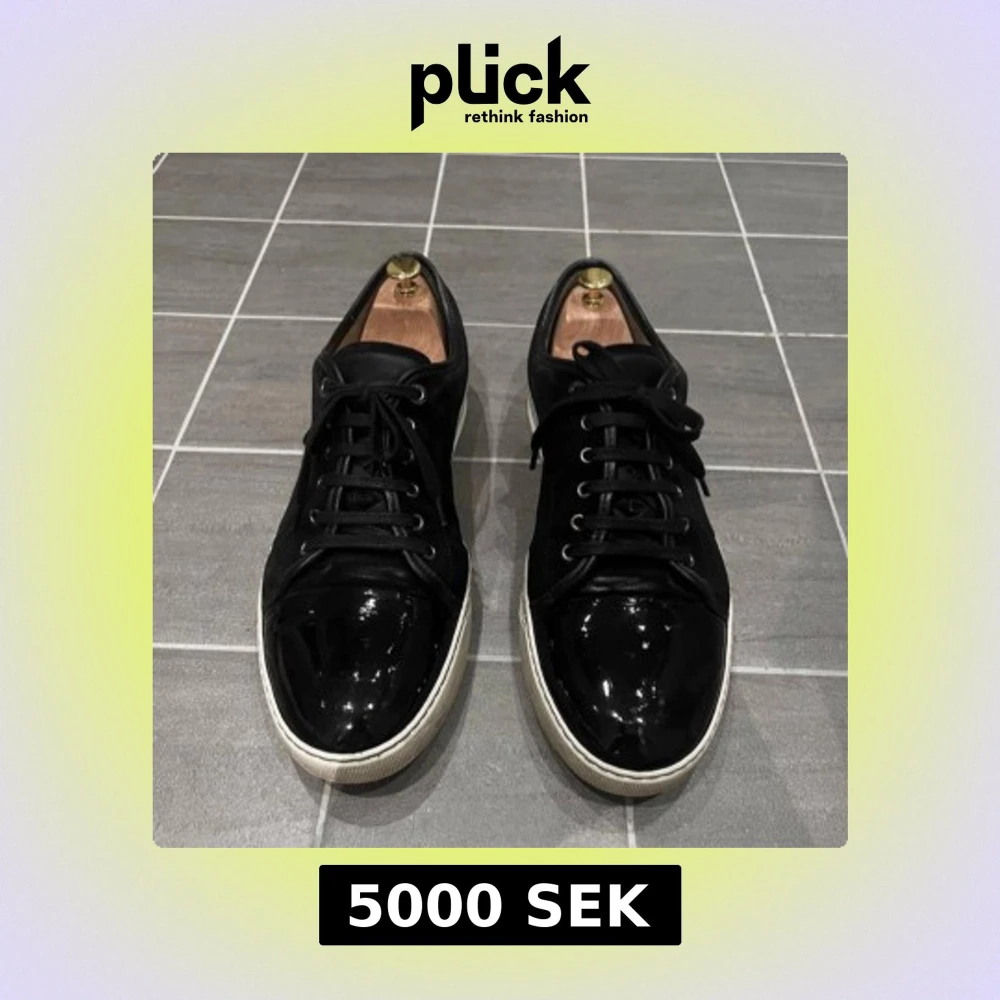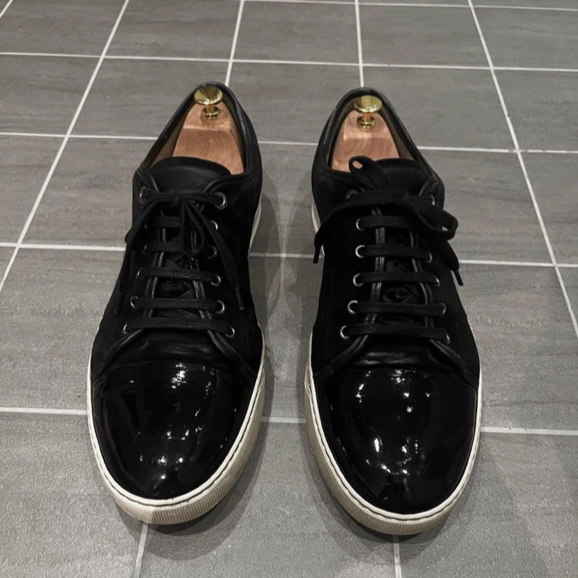 Snygga svarta sneakers med glansiga lackdetaljer och vit sula. Skorna har klassisk snörning och en stilren design som passar perfekt för en modern look.