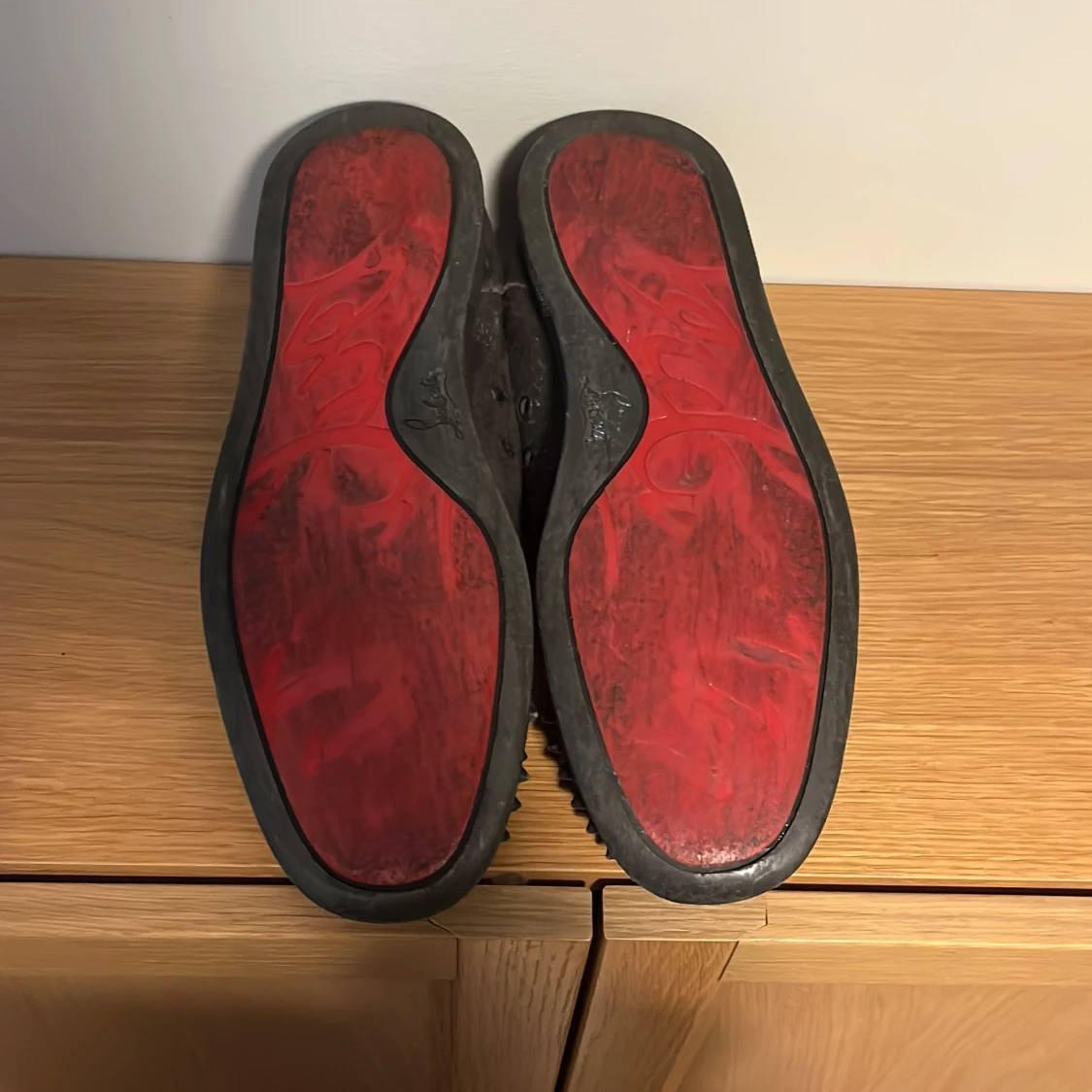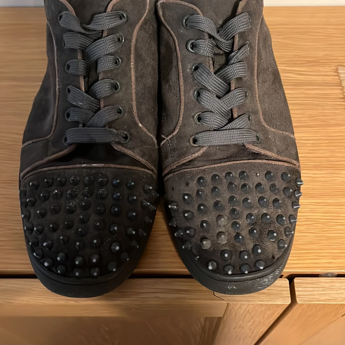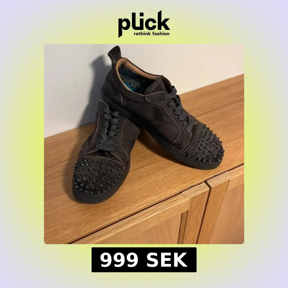 Snygga gråa Louboutins med nitar på tån och svarta snören. Skorna har en unik design med röd sula och är perfekta för en som söker efter pappas pengar stilen. Finns ett litet hål i hälen på högra skon men det märks inte av så länge man inte springer och hoppar. Storlek 43 men passar 44 om man har lite smalare fötter.