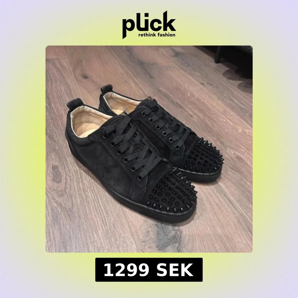 Snygga svarta sneakers med nitar på tån och sidorna. Skorna har en röd sula med ett märke. Perfekta för att ge en edgy touch till din stil.