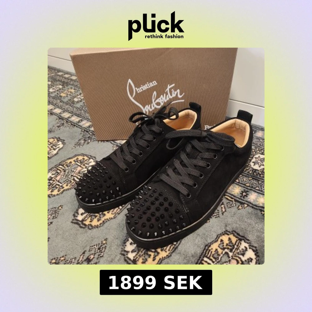 Säljer ett par svarta sneakers från Christian Louboutin med mattsvarta nitar på tån och klassisk röd sula. Skorna har snörning och är tillverkade i mocka med skinnfoder. Perfekta för dig som vill sticka ut med exklusiv stil.