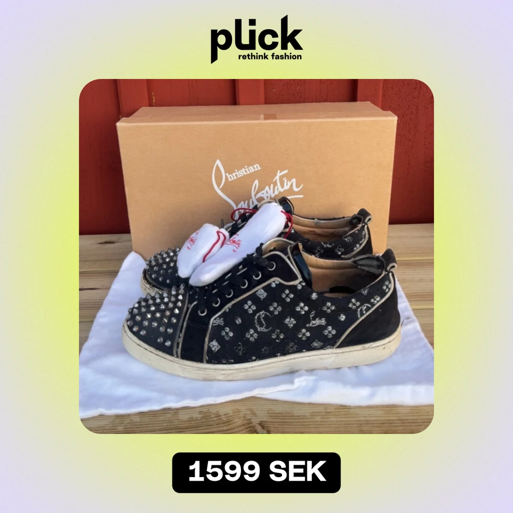 Säljer ett par coola svarta sneakers från Christian Louboutin med nitar på tån och ett mönster av vita symboler. Skorna har den klassiska röda sulan och är i bra skick. Perfekta för att ge din outfit en edgy touch! Storlek 45