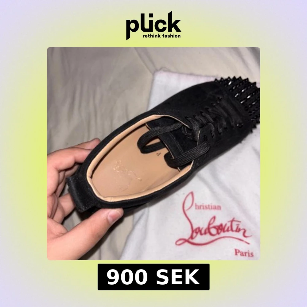 Snygga svarta sneakers från Christian Louboutin med nitar på tån. Skorna har en klassisk design med snörning och en röd sula som ger en ikonisk touch. Perfekta för att ge din outfit en edgy stil.