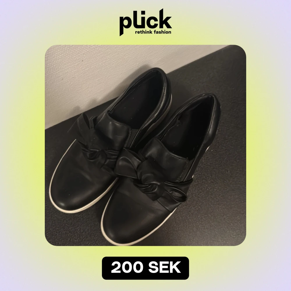 Säljer ett par snygga svarta sneakers i skinn med en cool rosettdetalj på ovansidan. De har en vit sula som ger en fräsch kontrast och är perfekta för både vardag och fest. Skorna är i bra skick och passar till många olika outfits. Perfekta för dig som vill ha något stilrent men ändå med en twist!