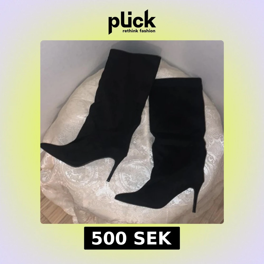 Svart matta stövlar/boots med en smal klack. Lite pösiga upptill i passformen. Helt oanvända i nytt skick. Storlek 39 och har ingen dragkedja. Längden på stövlarna är upp till under knät. Det är lättare att ta på sig skorna försiktigt med hjälp av skohorn. Ser ut att inte tåla vatten.