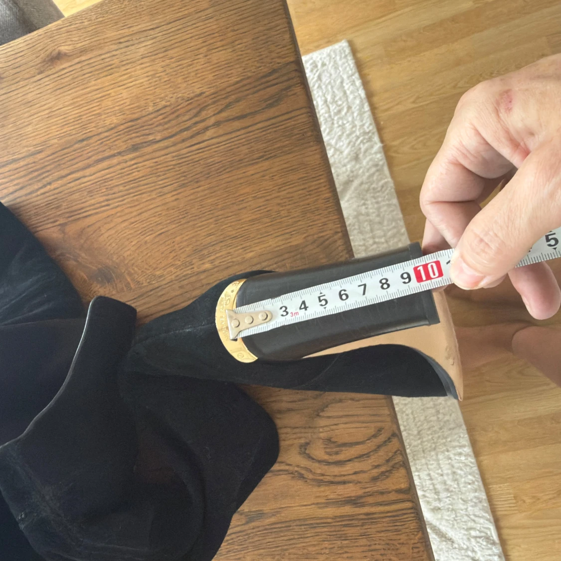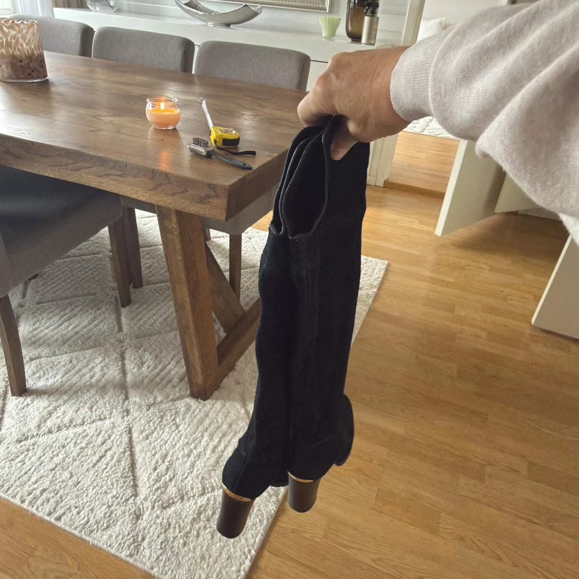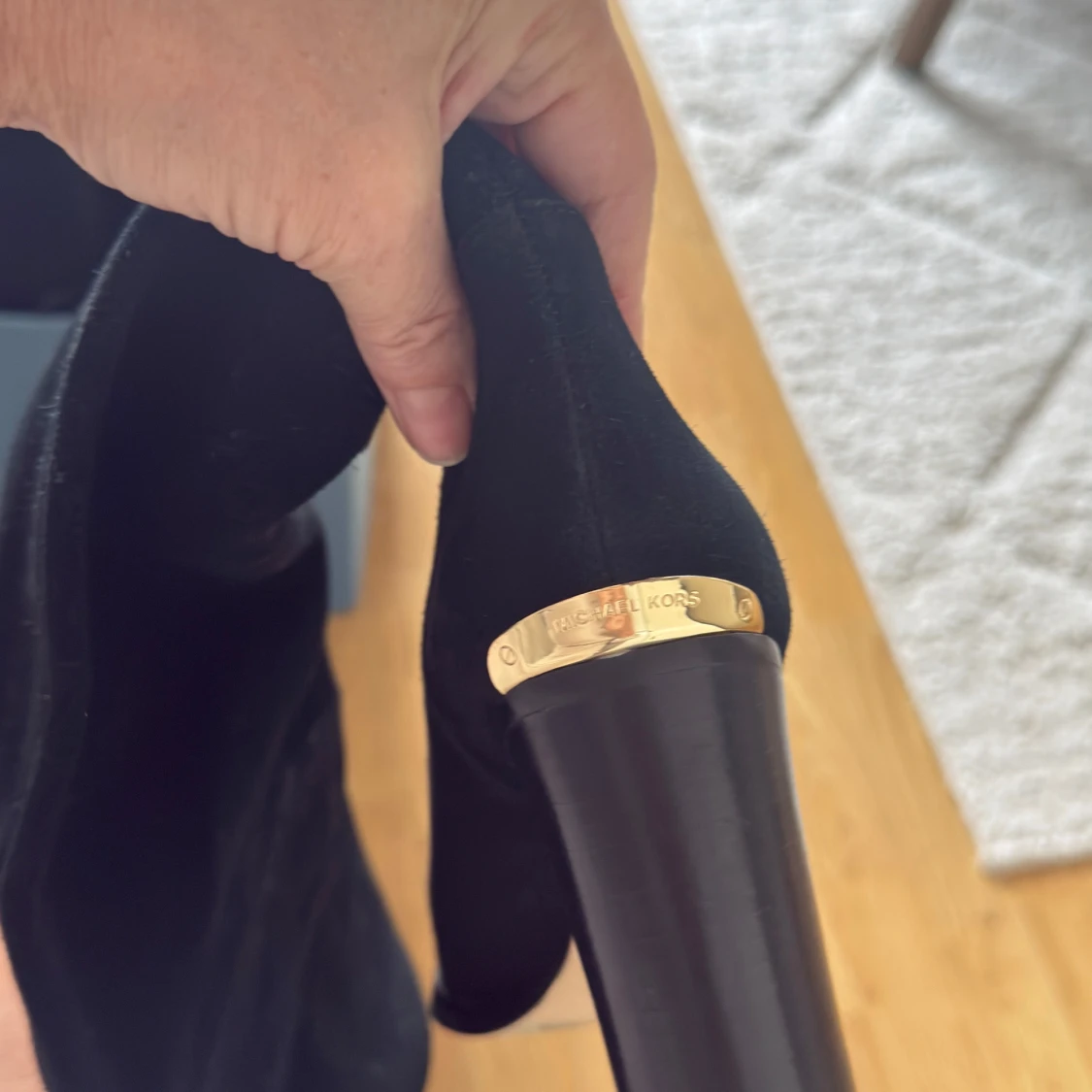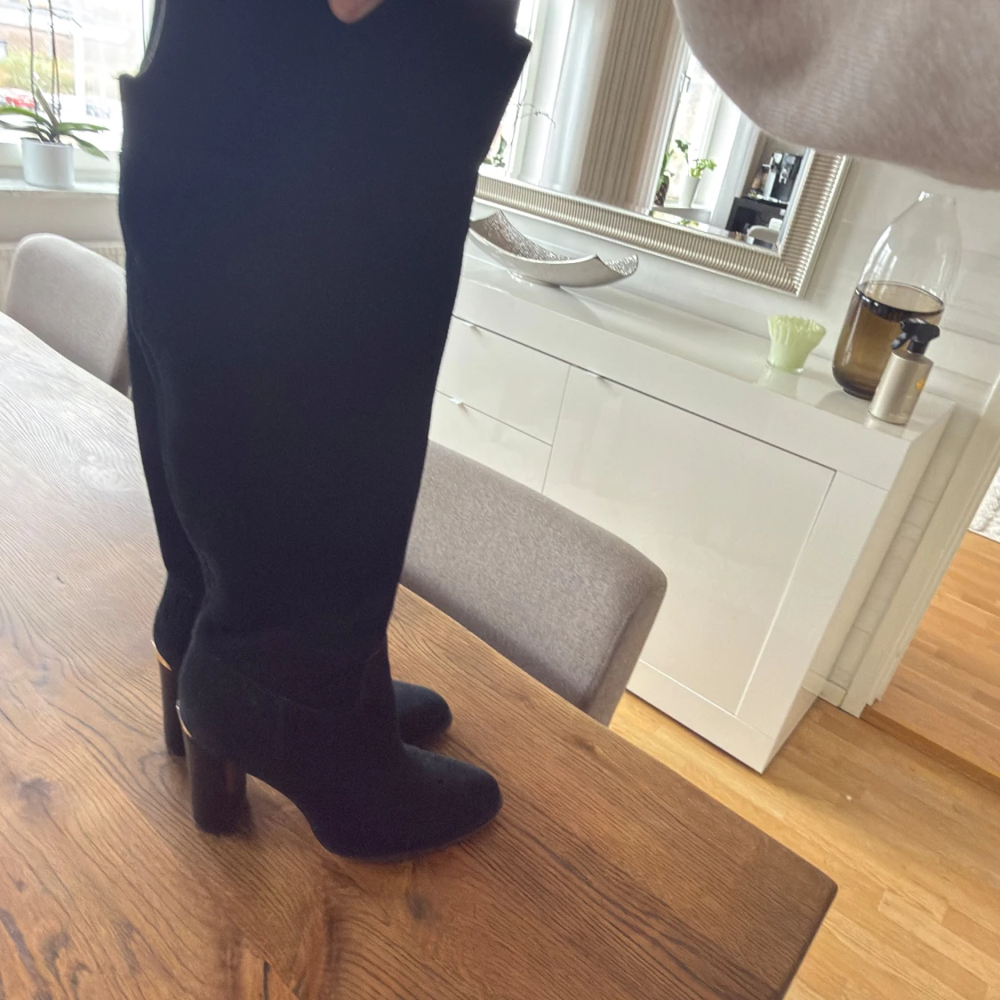Säljer ett par svarta höga stövlar från Michael Kors med snygg gulddetalj på klacken. Stövlarna har rund tå, hög klack och är tillverkade i mjuk mocka. Perfekta för dig som vill ha en stilren och lyxig look med extra edge.