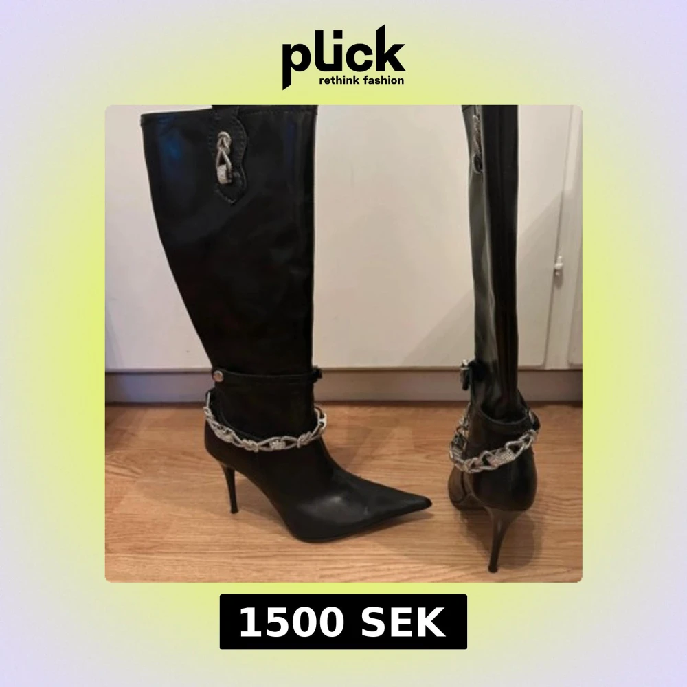 Snygga svarta stövlar med spetsig tå och hög klack. Dekorerade med en glittrig silverfärgad kedja runt ankeln och ett matchande silverhänge upptill. Perfekta för dig som vill sticka ut med detaljer och elegant vibe. Klacken är 10cm