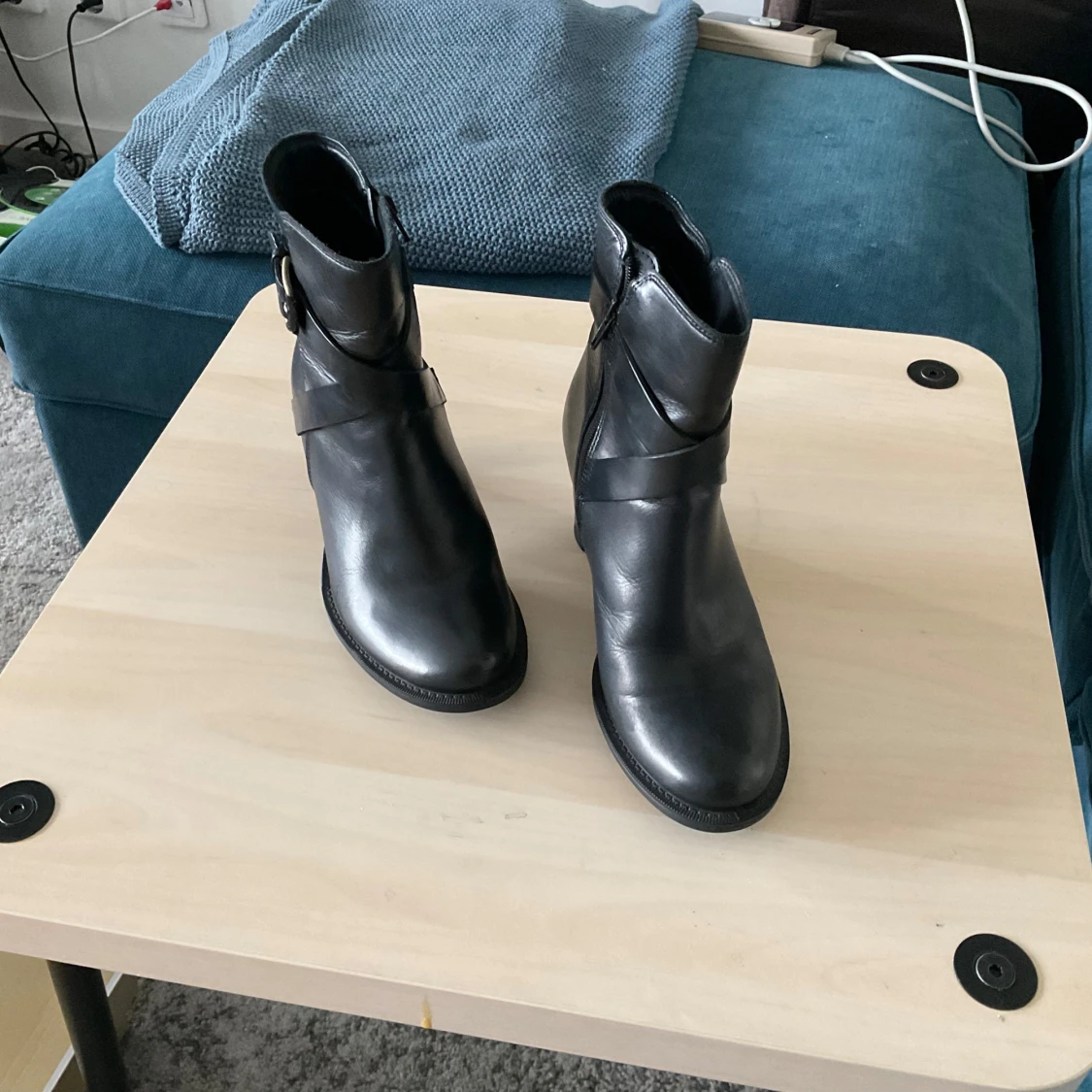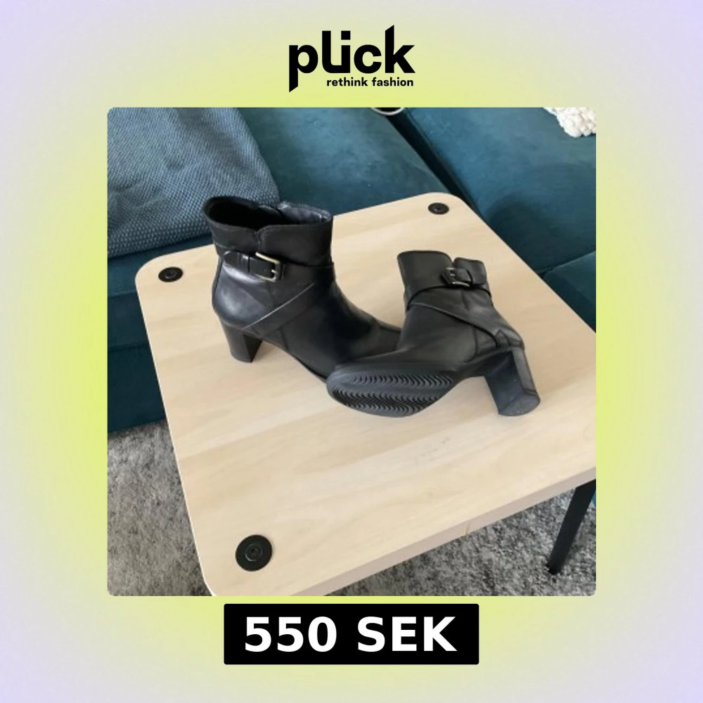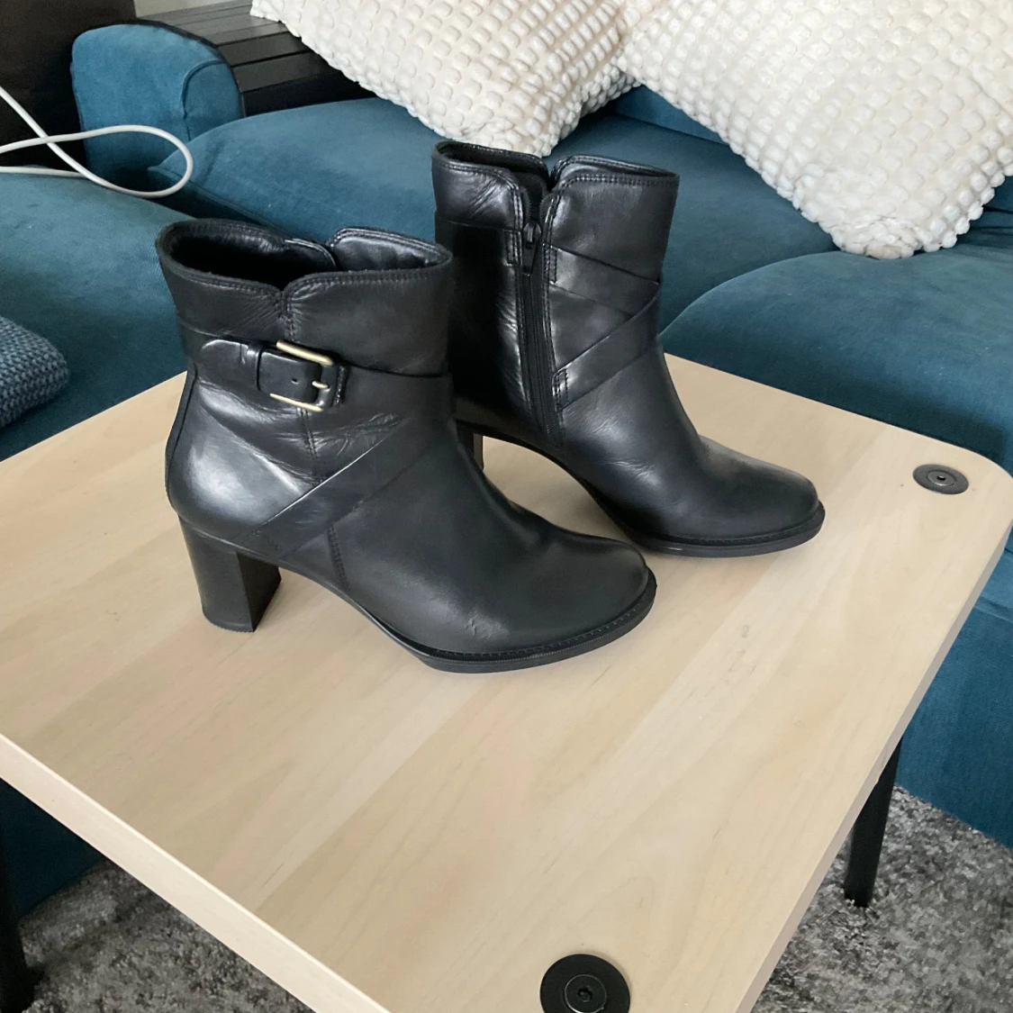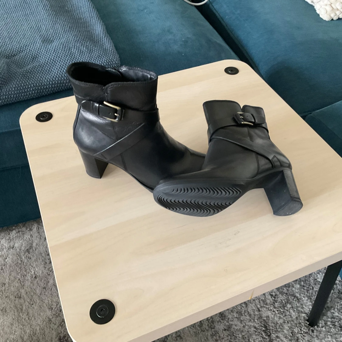 Snygga svarta stövletter i skinn med rund tå och stabil klack. Dekorativt spänne i metall runt ankeln och dragkedja på insidan för enkel på- och avtagning. Perfekta för dig som vill ha en stilren och edgy look.