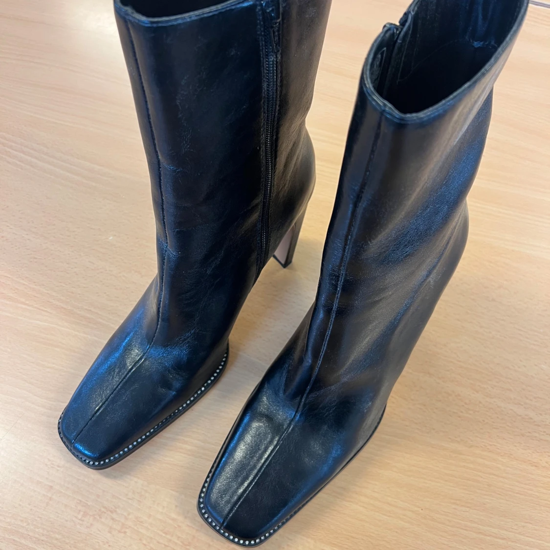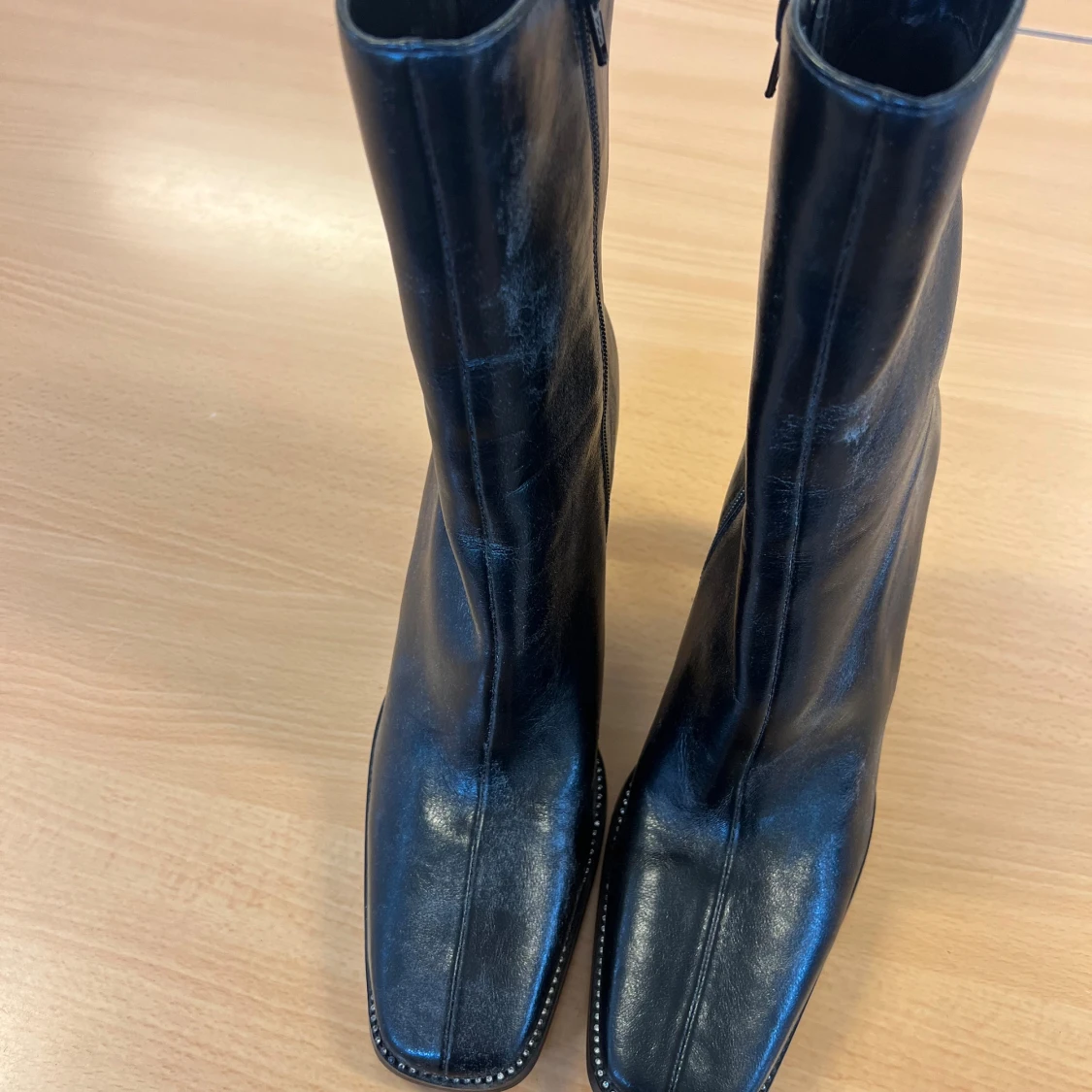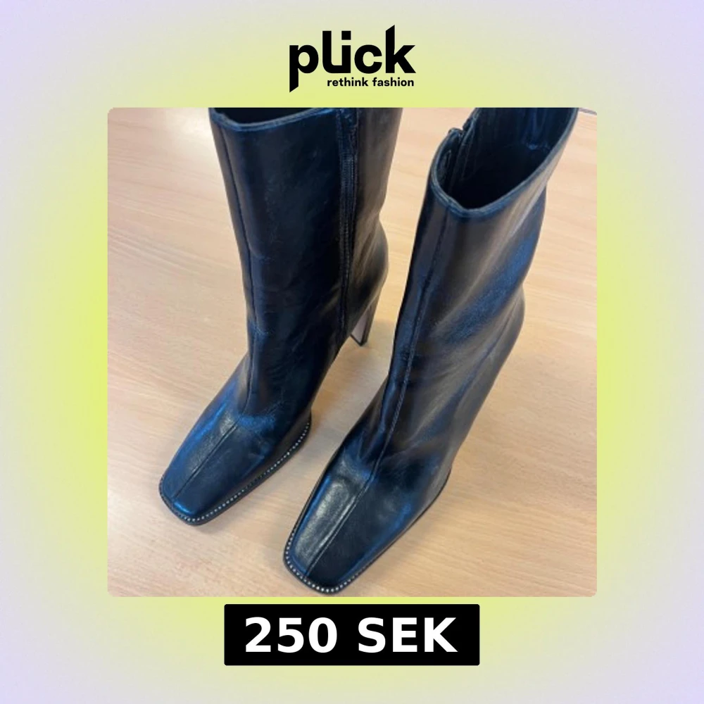 Snygga svarta stövletter från NA-KD i storlek 41. De har en fyrkantig tå, hög klack och dragkedja på sidan. Skorna är gjorda i skinnimitation och har dekorativa dekorationer/strass längs sulan för extra edge. Perfekta för dig som gillar statement boots.