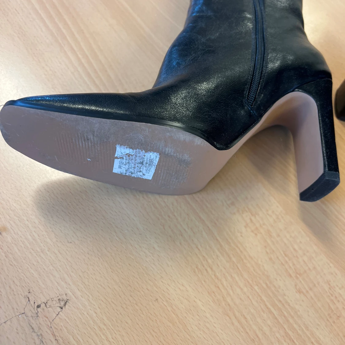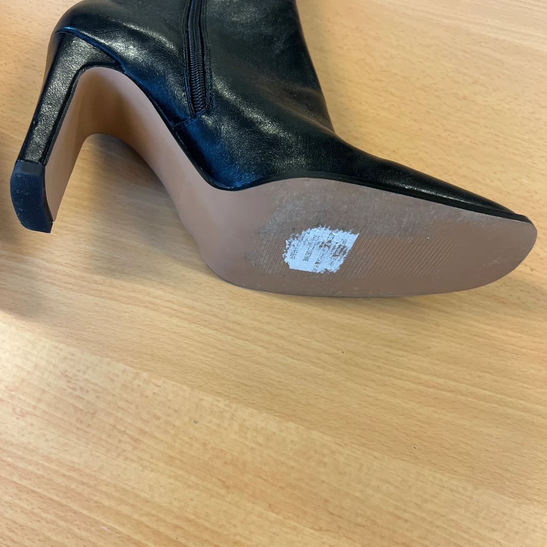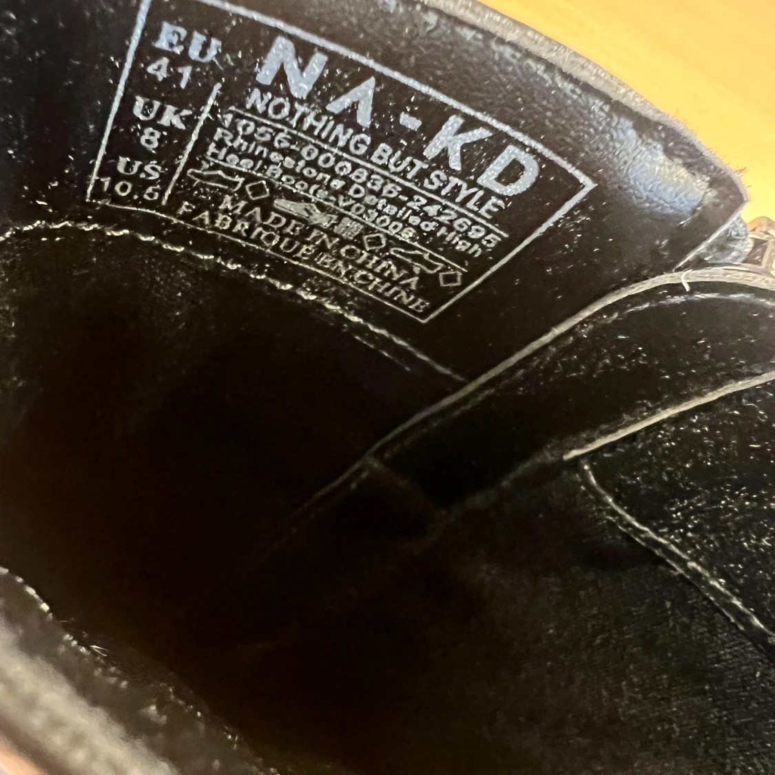 Snygga svarta stövletter från NA-KD i storlek 41. De har en fyrkantig tå, hög klack och dragkedja på sidan. Skorna är gjorda i skinnimitation och har dekorativa dekorationer/strass längs sulan för extra edge. Perfekta för dig som gillar statement boots.