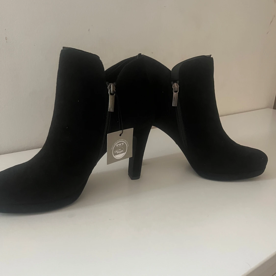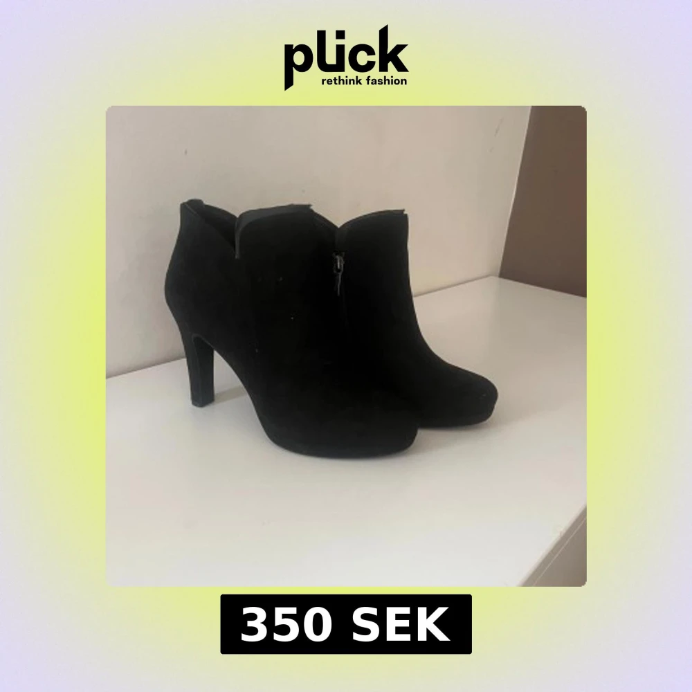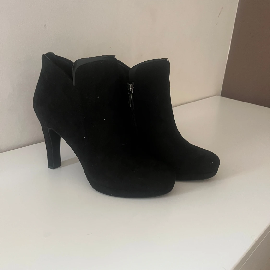 Snygga svarta stövletter i mocka med dragkedja på sidan. Oanvända. Hund finns i hemmet.