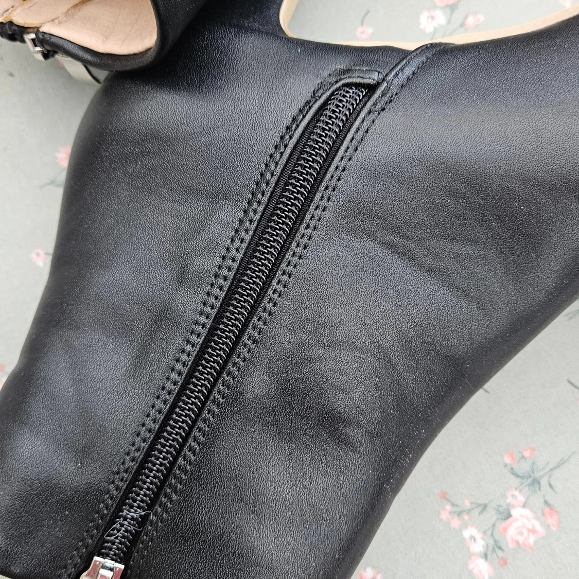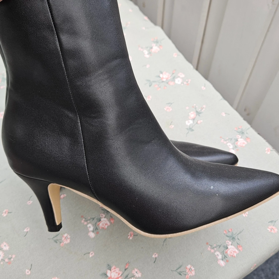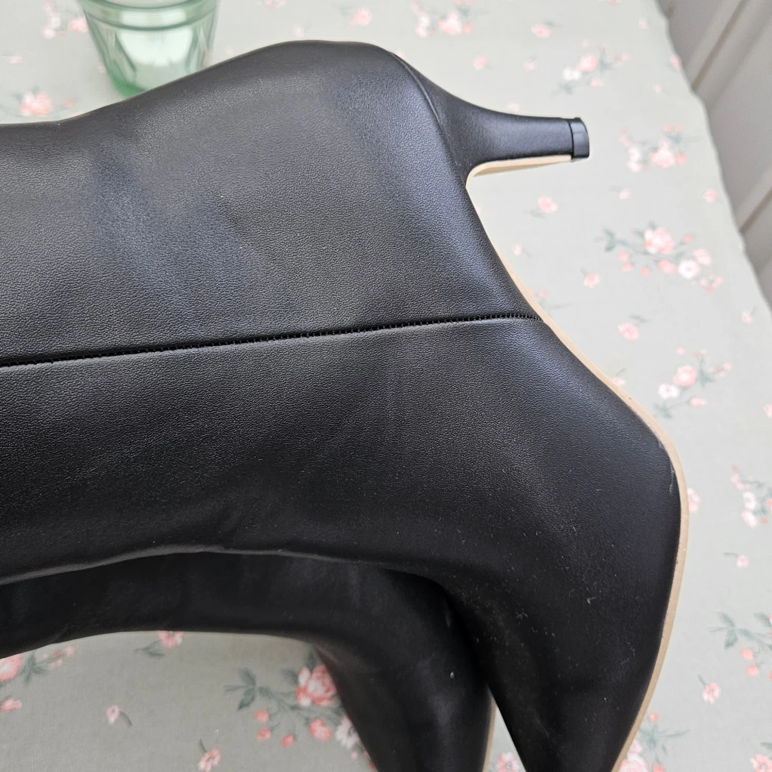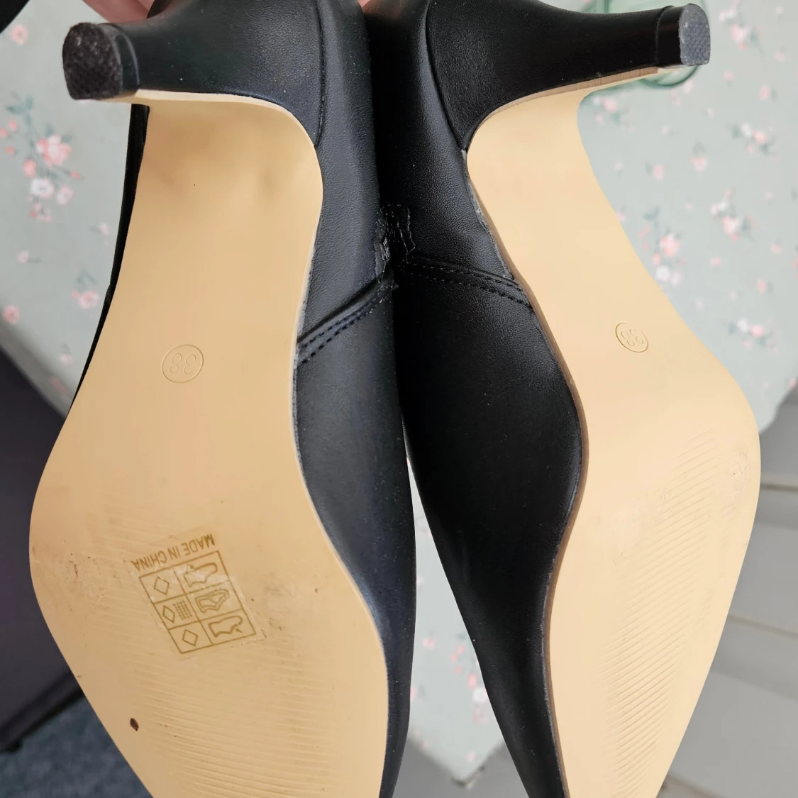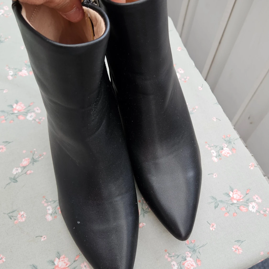 Snygga svarta stövletter i skinn med spetsig tå och smal klack. Skorna har dragkedja på insidan för enkel på- och avtagning. Perfekta för dig som vill ha en stilren och trendig look till höst och vinter. Ganska små i storl.