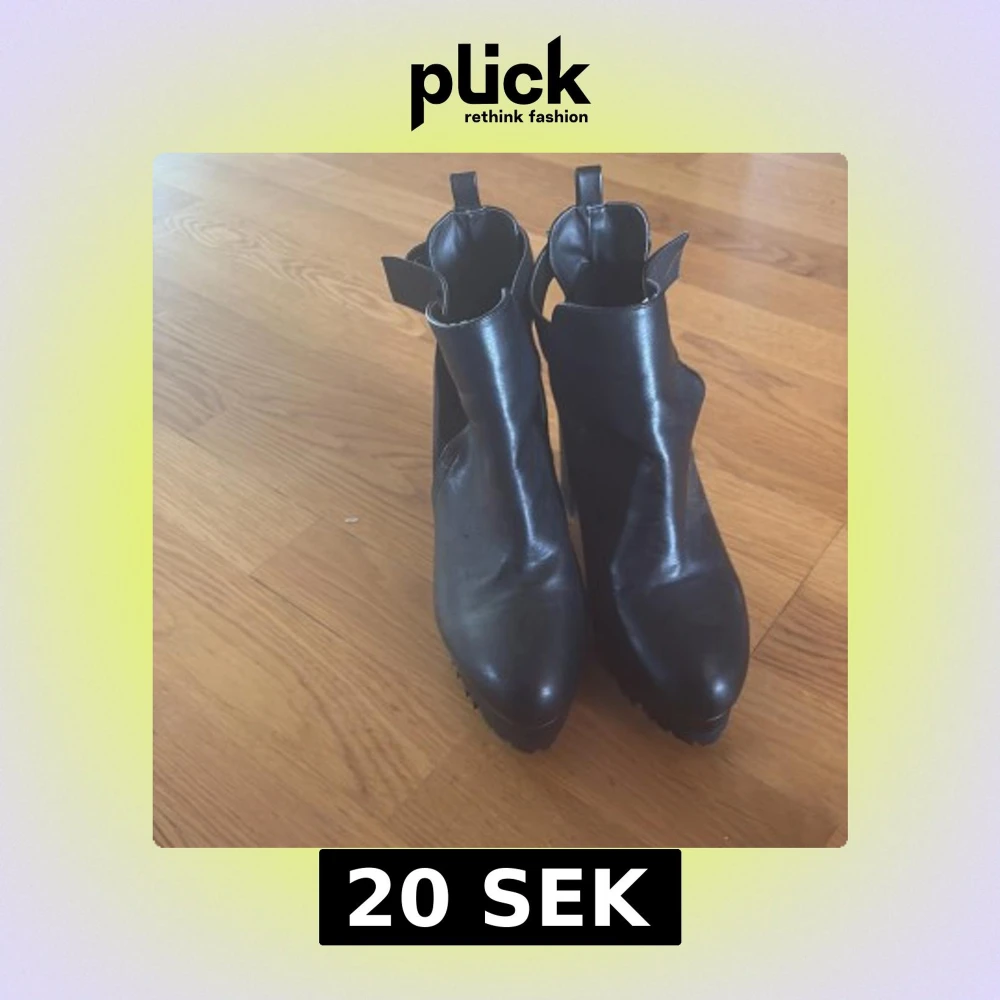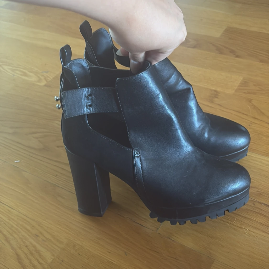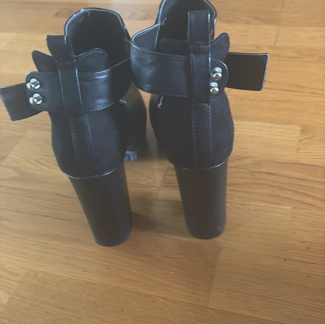Snygga svarta stövletter i skinnliknande material med chunky hög klack och plattform. Skorna har coola cut-out detaljer på sidorna och rem med silvriga nitar baktill. Perfekta för dig som vill ha en edgy look med extra höjd.