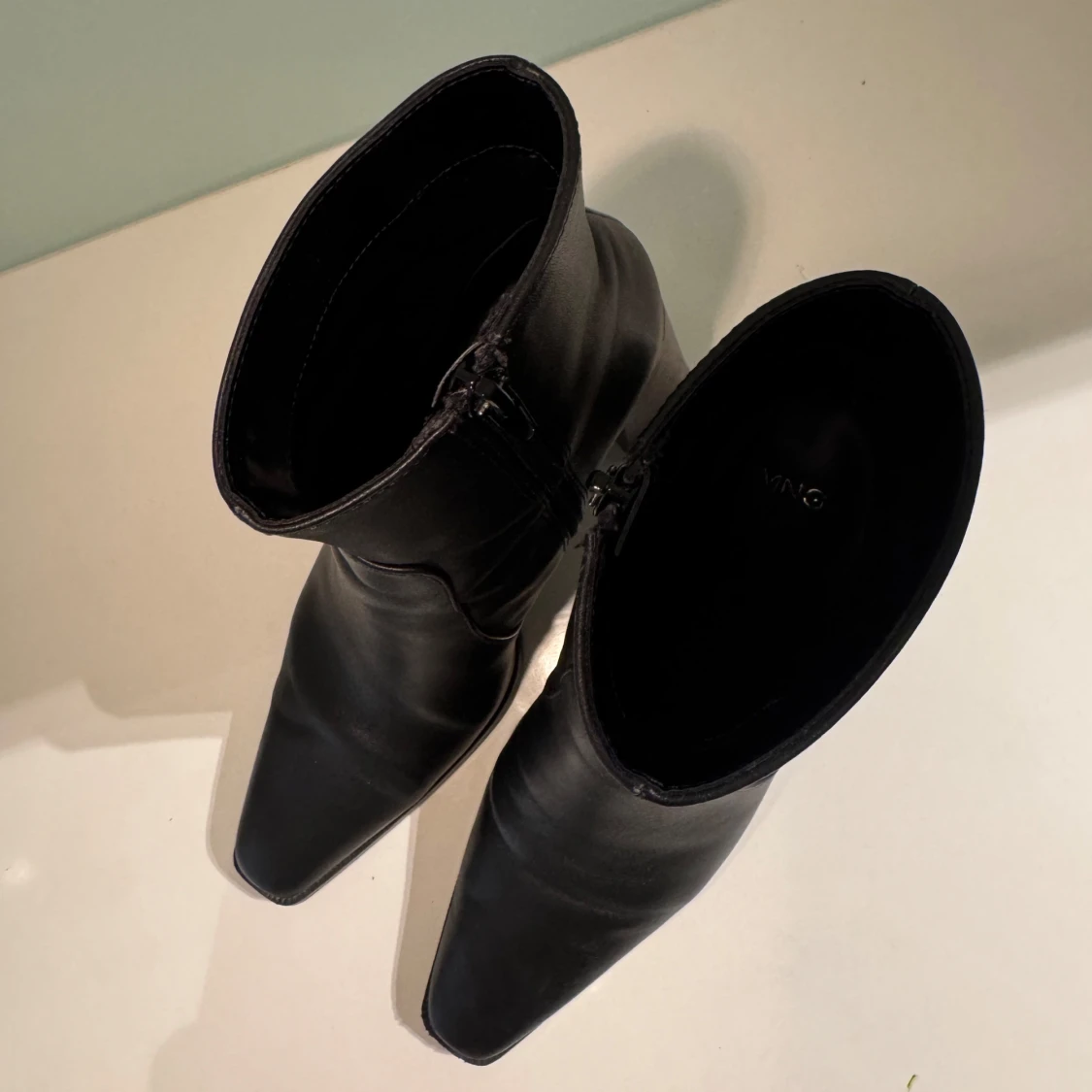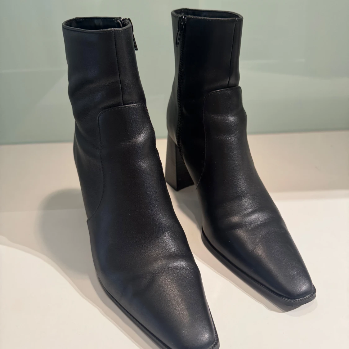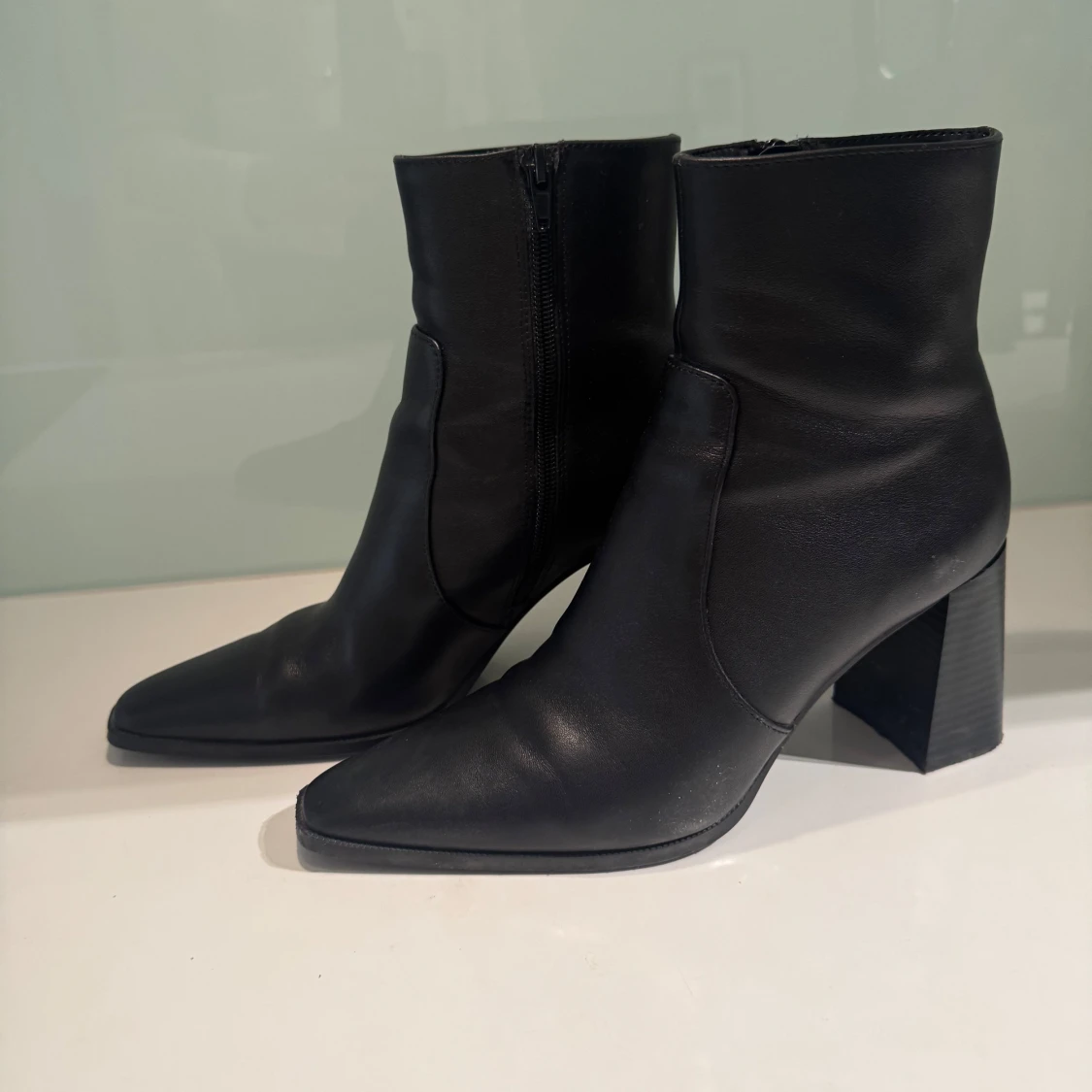 Snygga svarta stövletter i skinn med en elegant spetsig tå och praktisk dragkedja på sidan. De har en stabil klack som ger extra höjd och stil. Perfekta för att komplettera din outfit med en touch av elegans.