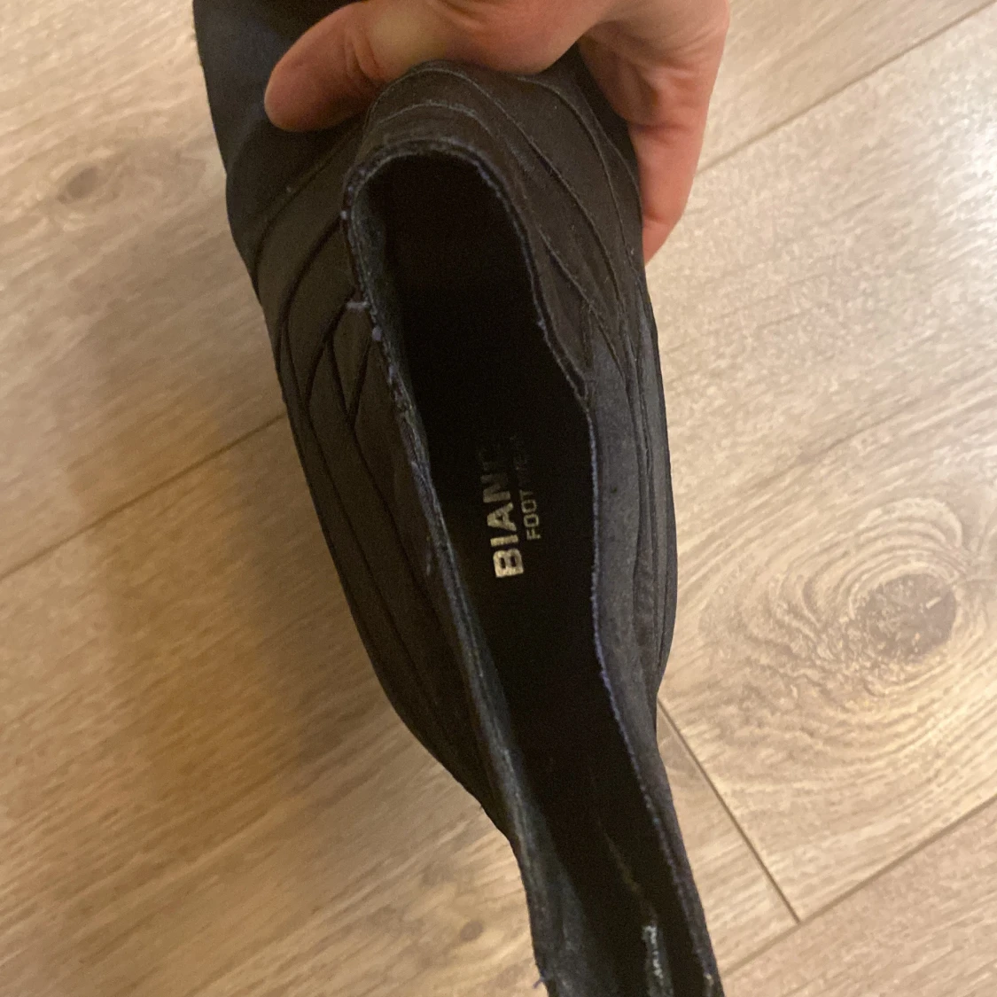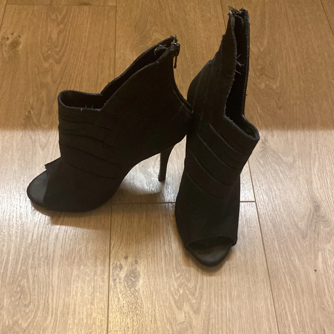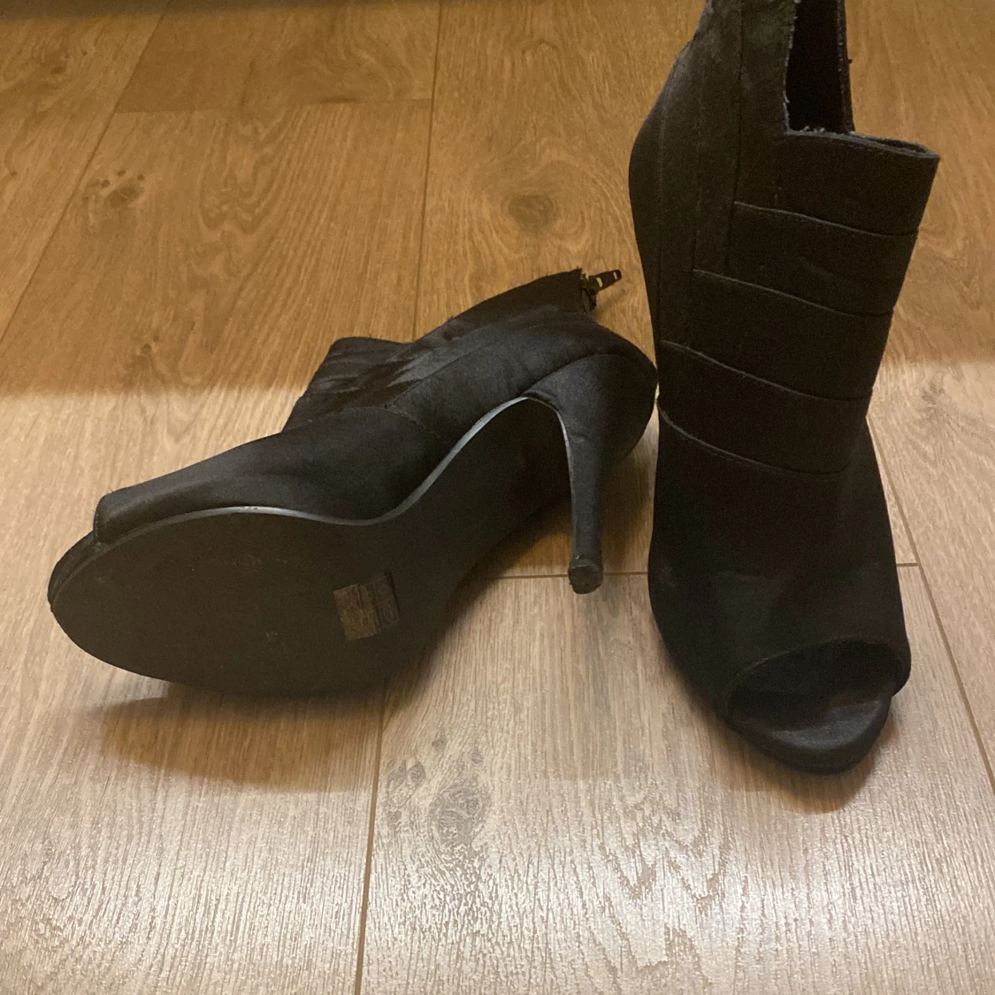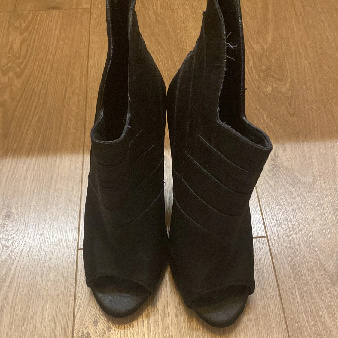 Svarta stövletter från BIANCO med hög klack och öppen tå. Snyggt ribbade detaljer på ovansidan och dragkedja baktill. Tillverkade i mocka för en lyxig känsla. Perfekt för dig som vill ha en edgy och stilren look.
