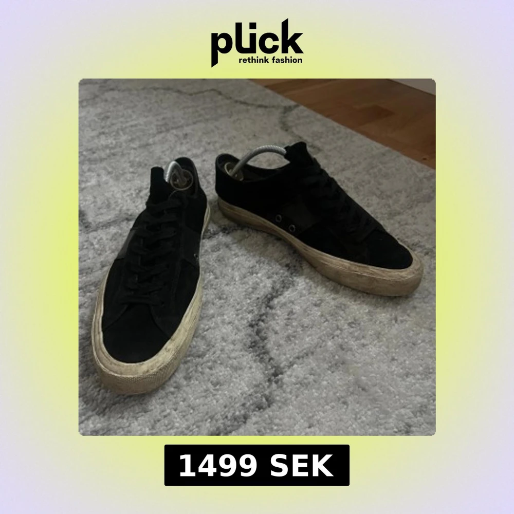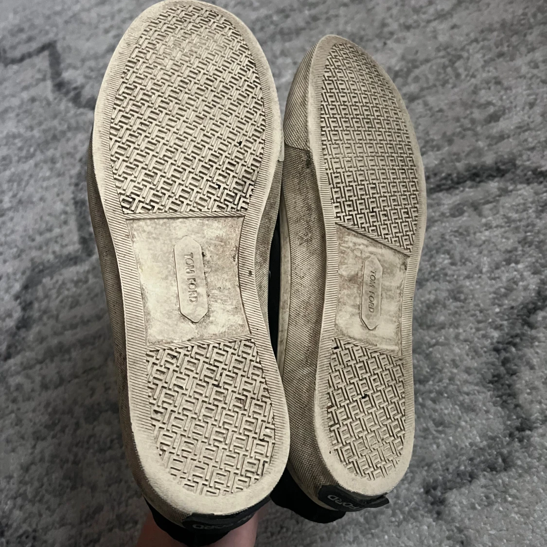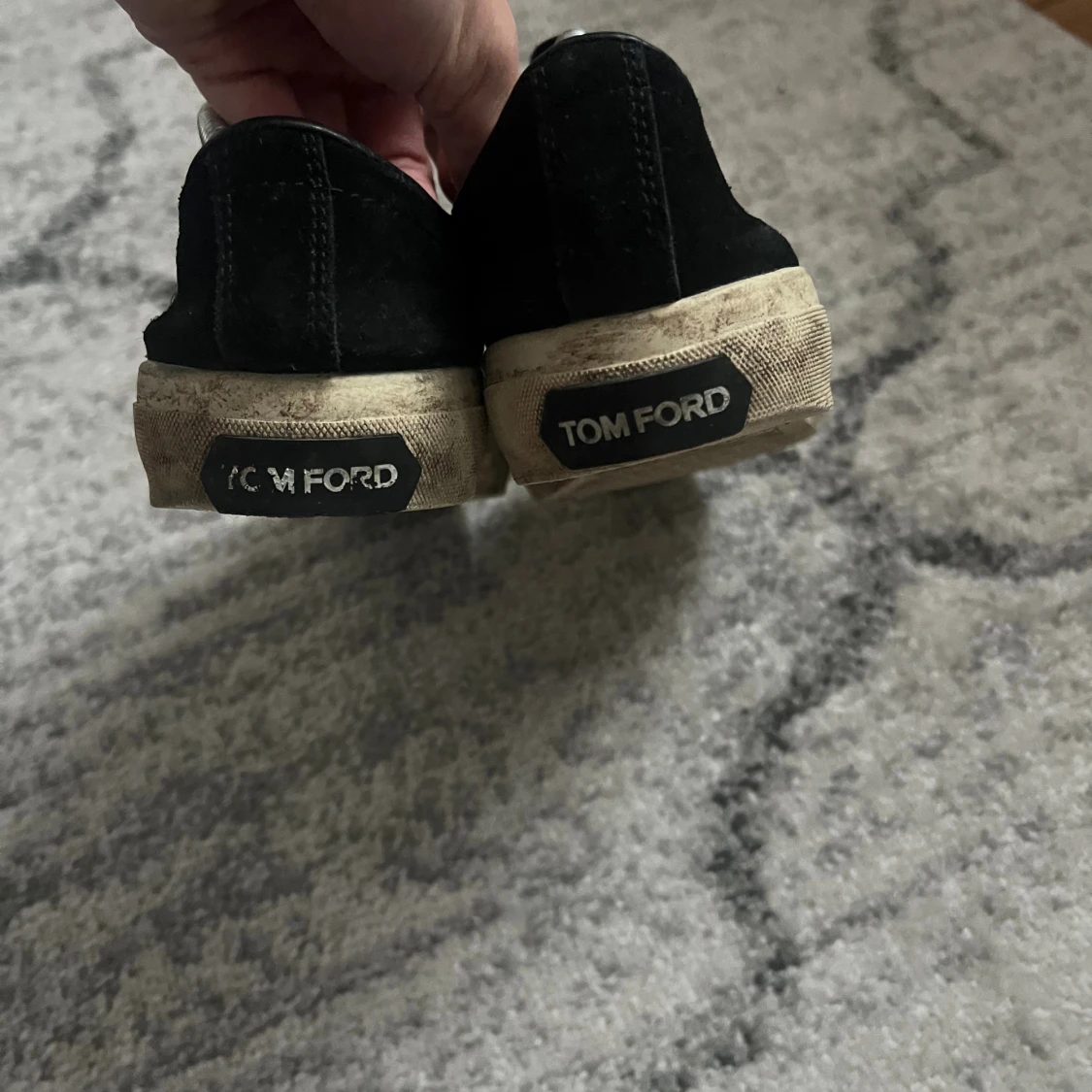 Svarta sneakers från Tom Ford i mjuk mocka med klassisk låg profil och rund tå. Skorna har snörning och en beige, något smutsad gummisula med Tom Ford-logga baktill och under sulan. Perfekta för dig som gillar stilrena och exklusiva sneakers.