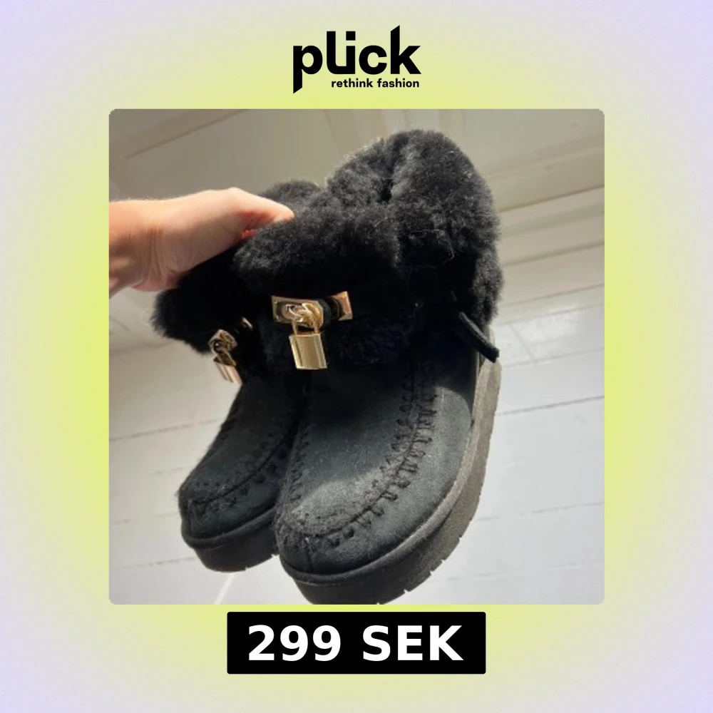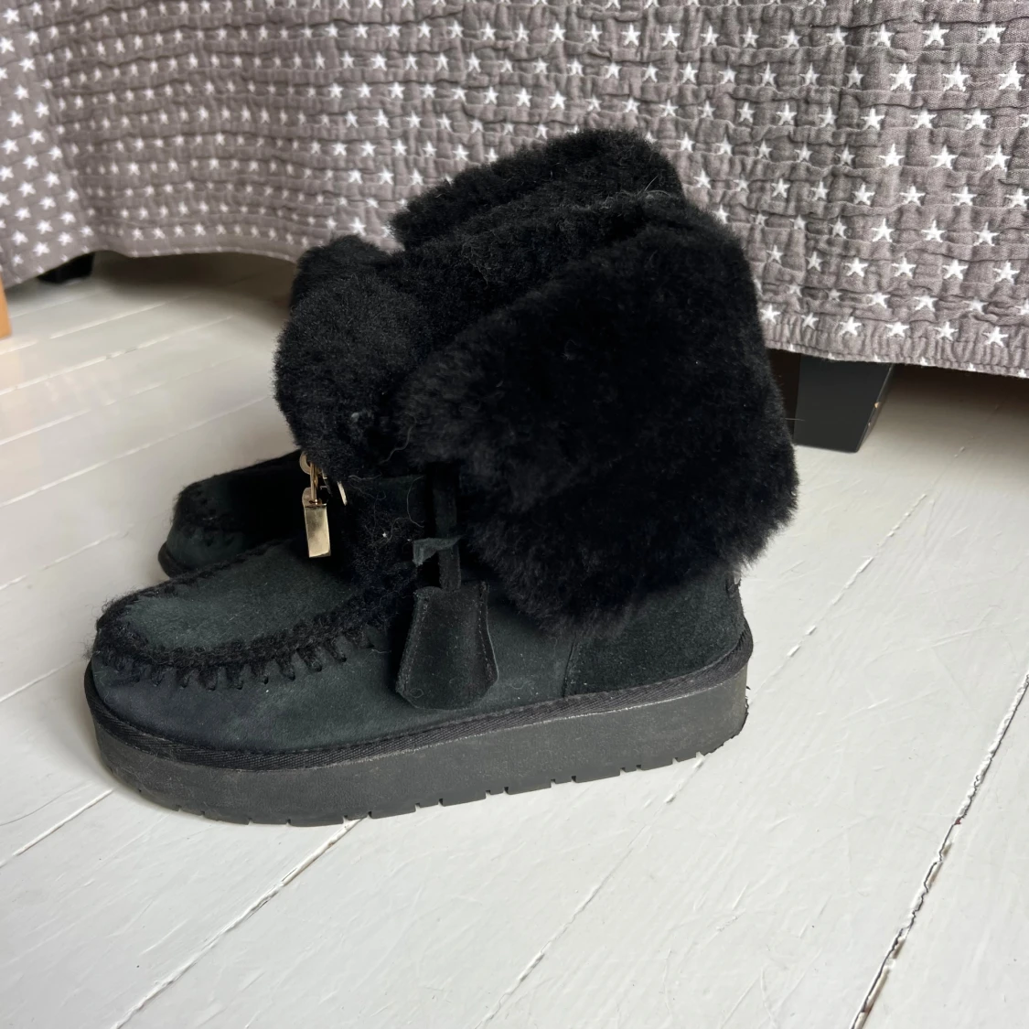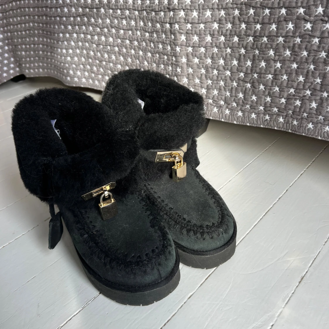 Unika svarta boots med fluffig päls runt skaftet och snygga guldfärgade låsdetaljer framtill. Skorna är inköpta i Italien från ett fint märke och är i gott skick!