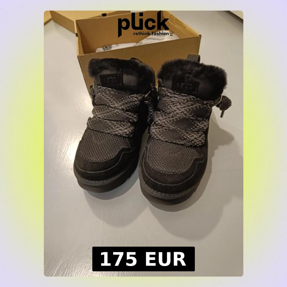 Säljer ett par svarta UGG boots med grov snörning och fluffig päls runt kanten. Skorna har en platt, mönstrad sula för extra grepp och är tillverkade i mocka och syntetmaterial. Perfekta för kalla dagar med sin mysiga insida och robusta design.
