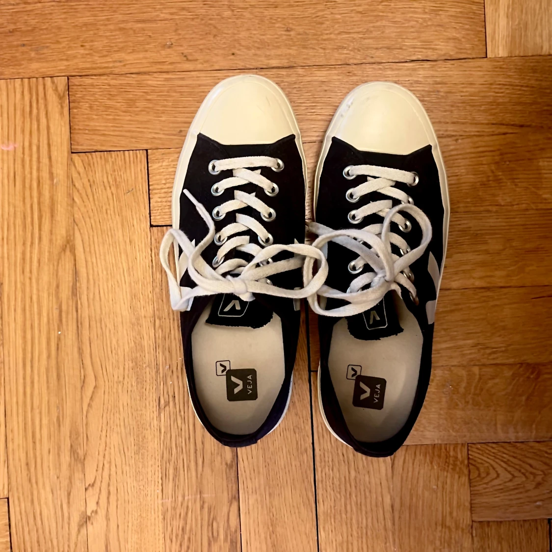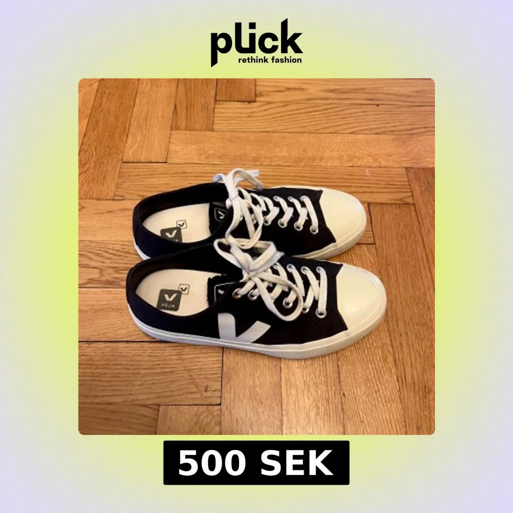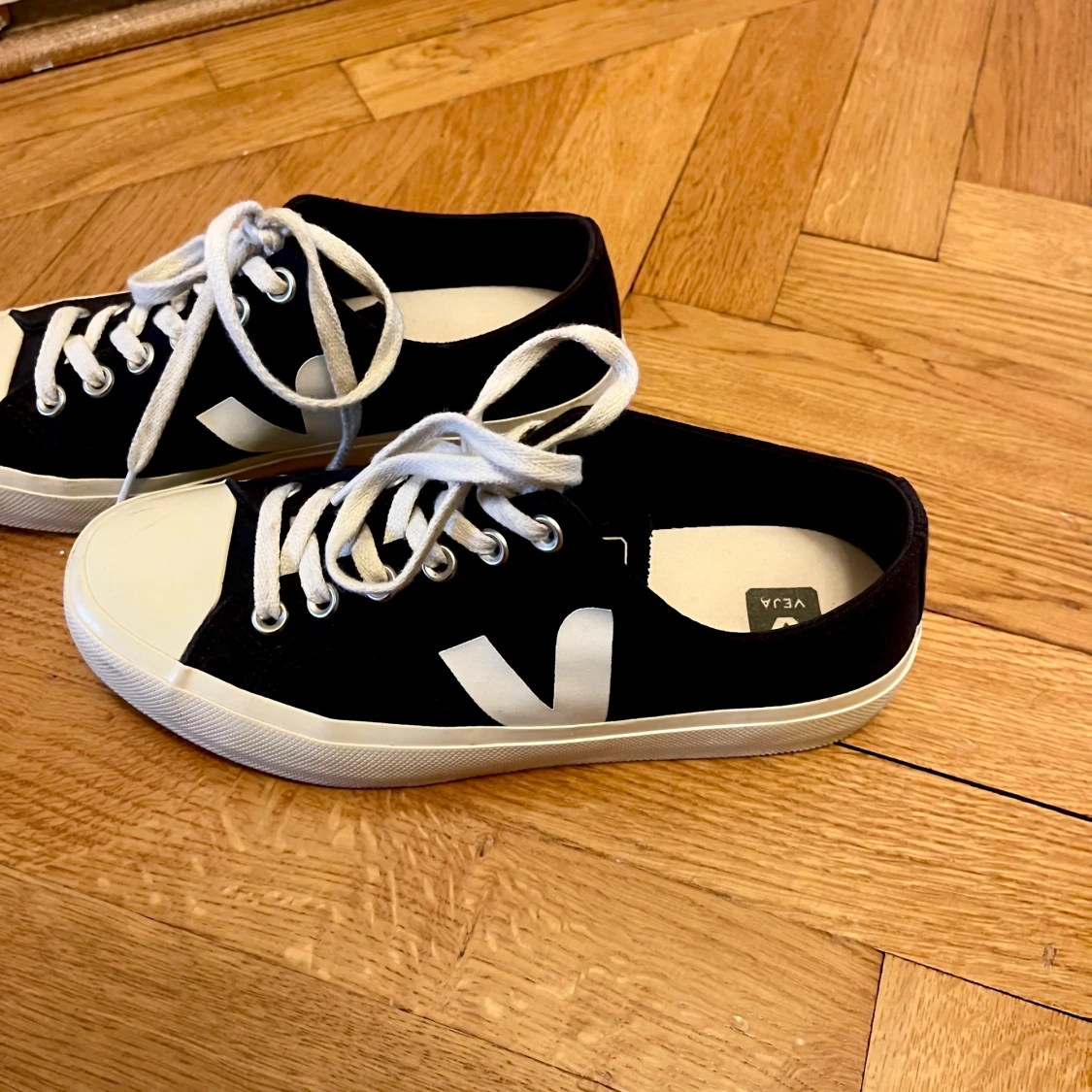 Snygga svarta Veja sneakers med vit tå och sula samt stora vita V-loggor på sidorna. Skorna har klassisk snörning och är tillverkade i canvas med gummidetaljer. Perfekta för dig som gillar stilrena och trendiga sneakers. Dom har bara använts några gånger. Tveka inte på att skriva om du har några frågor eller vill ha fler bilder!