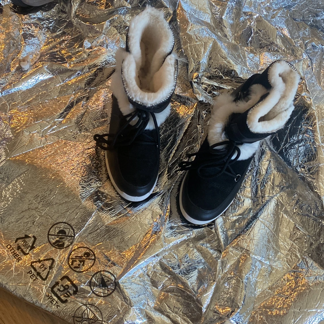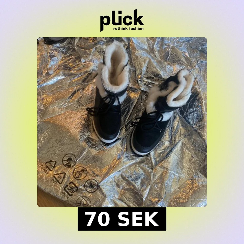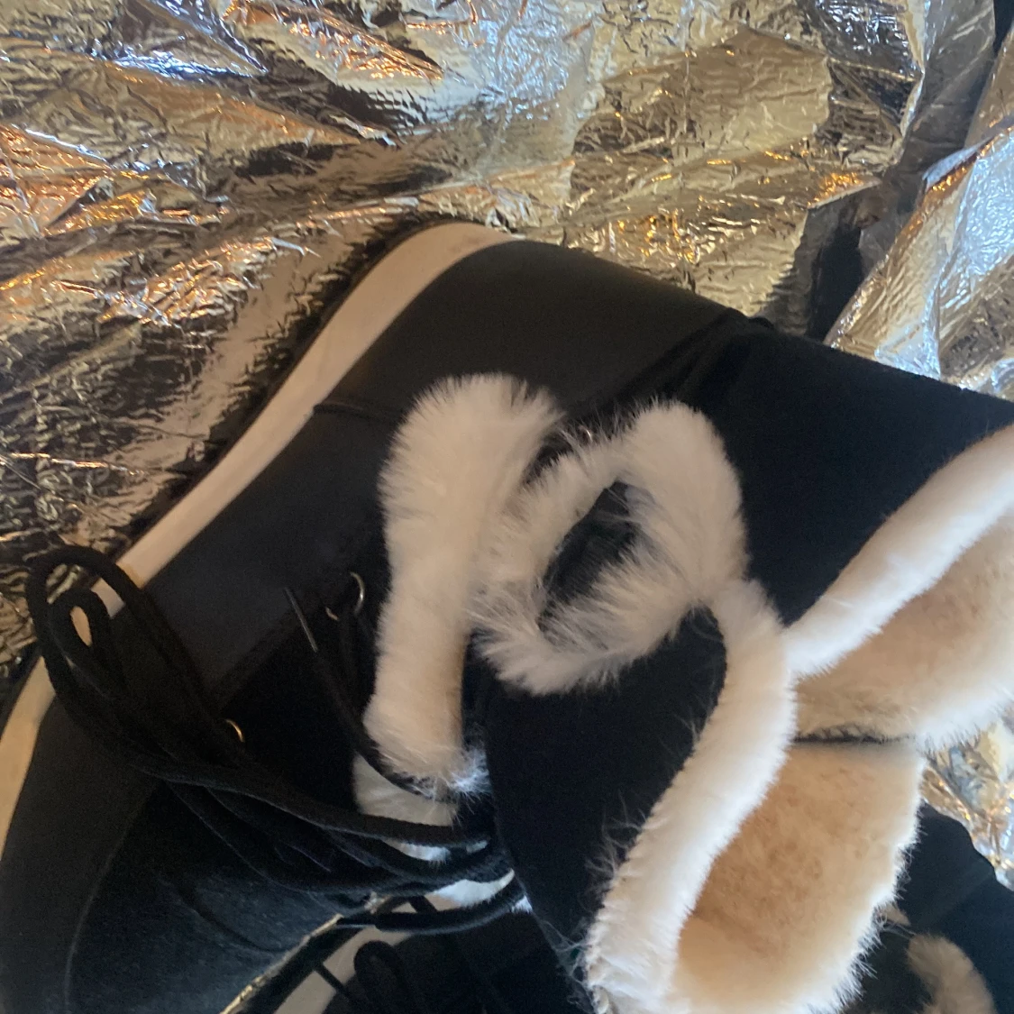 Säljer ett par svarta vinterboots med vit fuskpäls runt skaftet och insidan. Skorna har snörning framtill och en tjock vit sula. Perfekta för kalla dagar när du vill hålla fötterna varma och snygga.