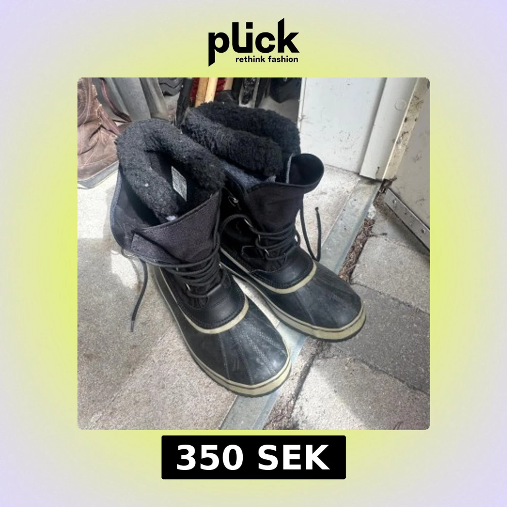 Rejäla svarta vinterkängor från Sorel med snörning och varm, mjuk fuskpäls på insidan. Yttermaterialet är en mix av textil och gummi, perfekt för kalla och blöta dagar. Klassisk design med rund tå och platt sula.