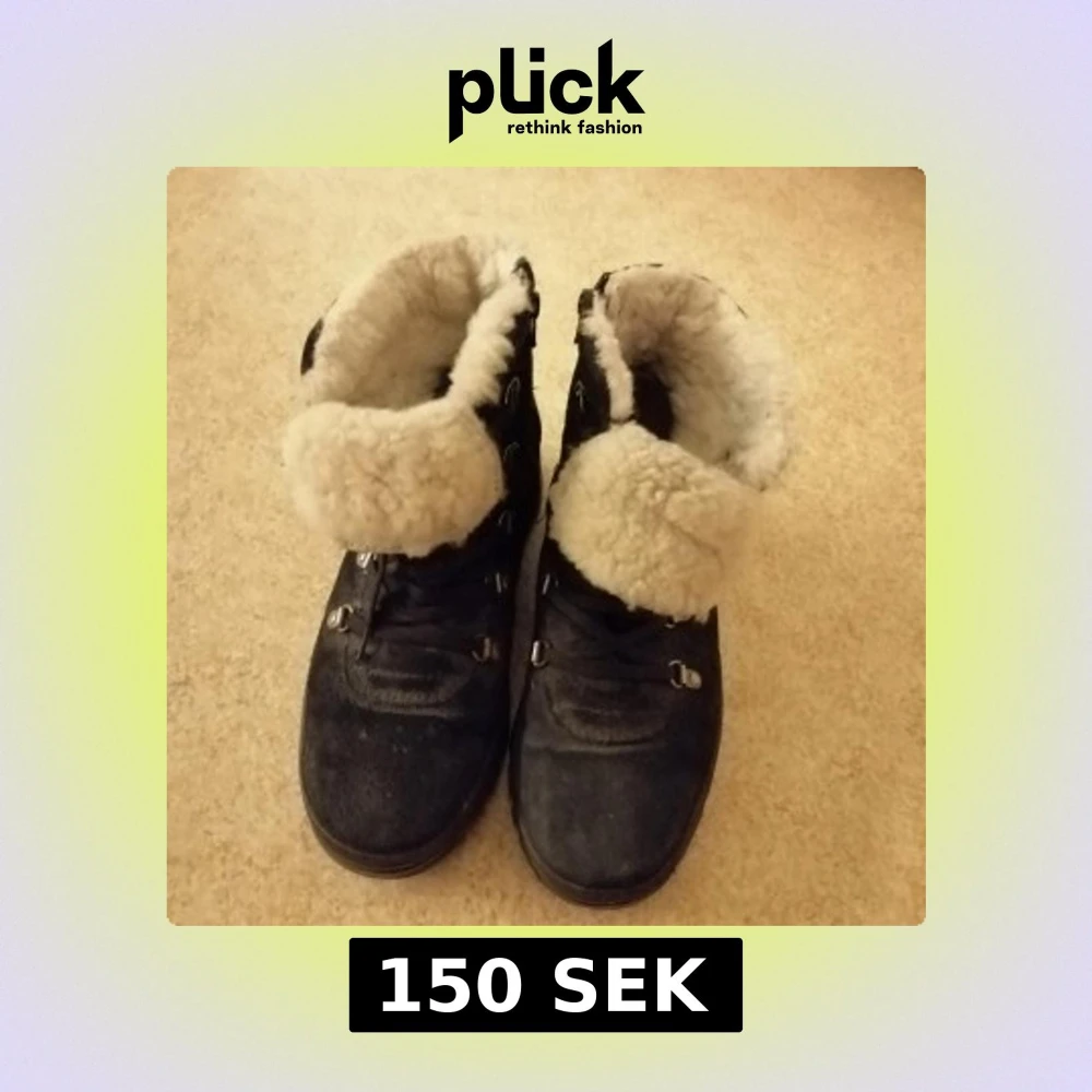 Svarta kängor med inbyggda broddar och snörning, fodrade med mjukt vitt fårskinn. Ovandel i mocka och detaljer i metall. Snyggt uppvikta kanter och dragkedja på sidan för enkel på- och avtagning. Väl använda men finns inga defekter. Nyckel för att fälla upp broddarna följer med. Husdjur finns i hemmet.