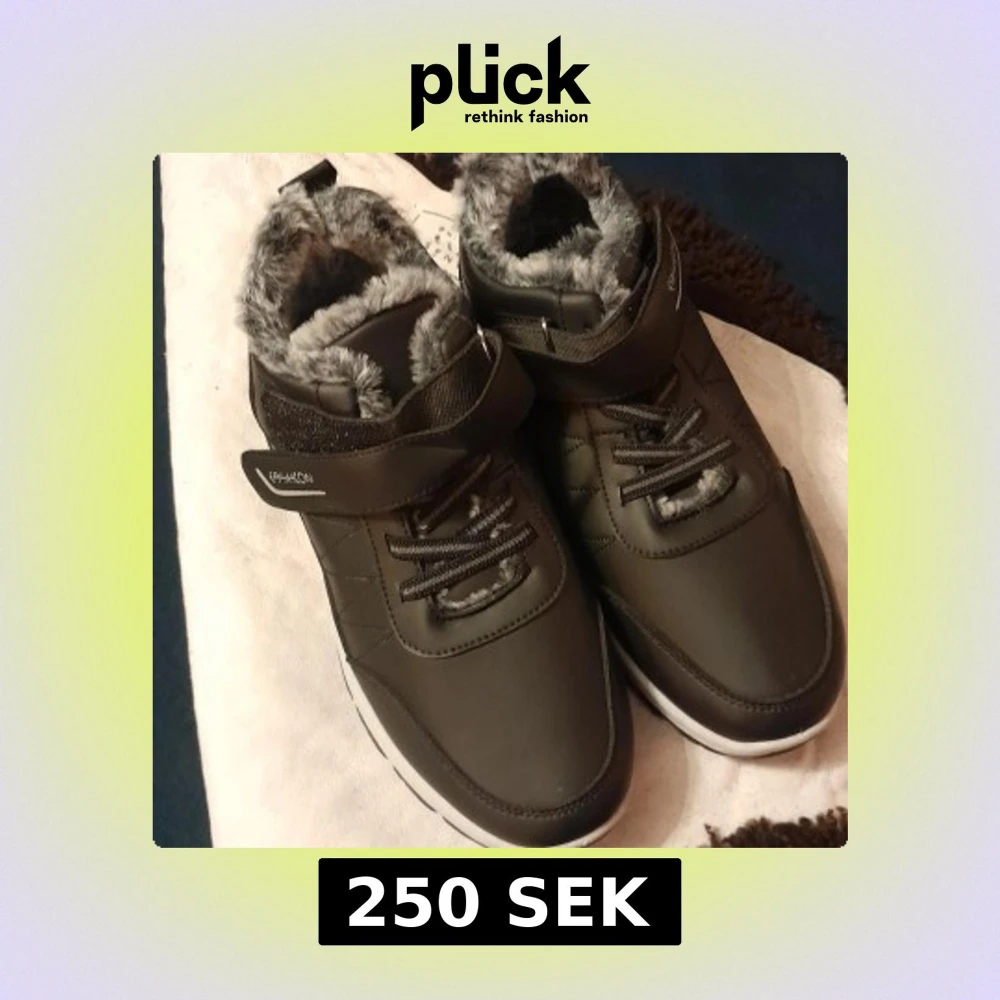 Snygga svarta kängor från Echox med fuskpälsfoder och snörning. De har en robust sula med rött mönster för extra grepp. Perfekta för kalla vinterdagar.