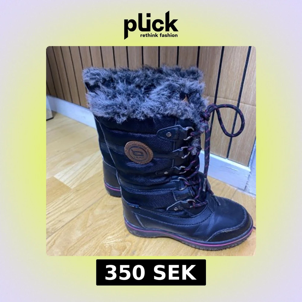 Svarta vinterstövlar från Leaf med högt skaft, snörning och mysig grå fuskpäls runt kanten. Stövlarna har detaljer i skinn och textil samt en dekorativ rand i rosa på sulan. Perfekta för kalla dagar när du vill hålla stilen och värmen.