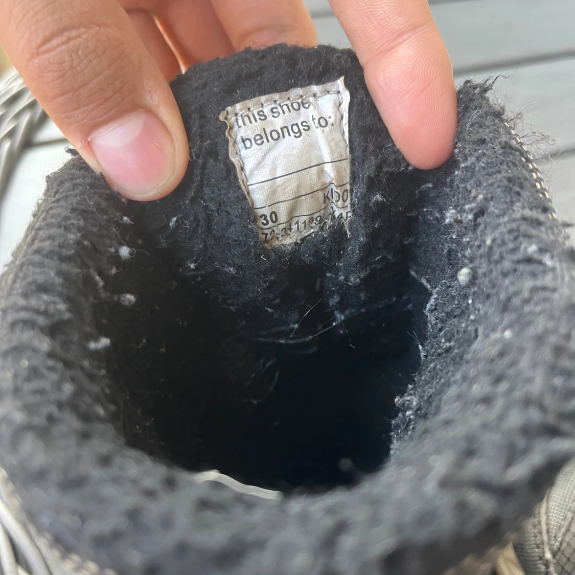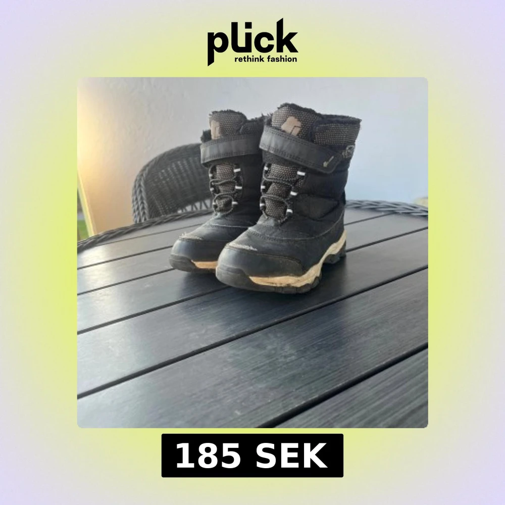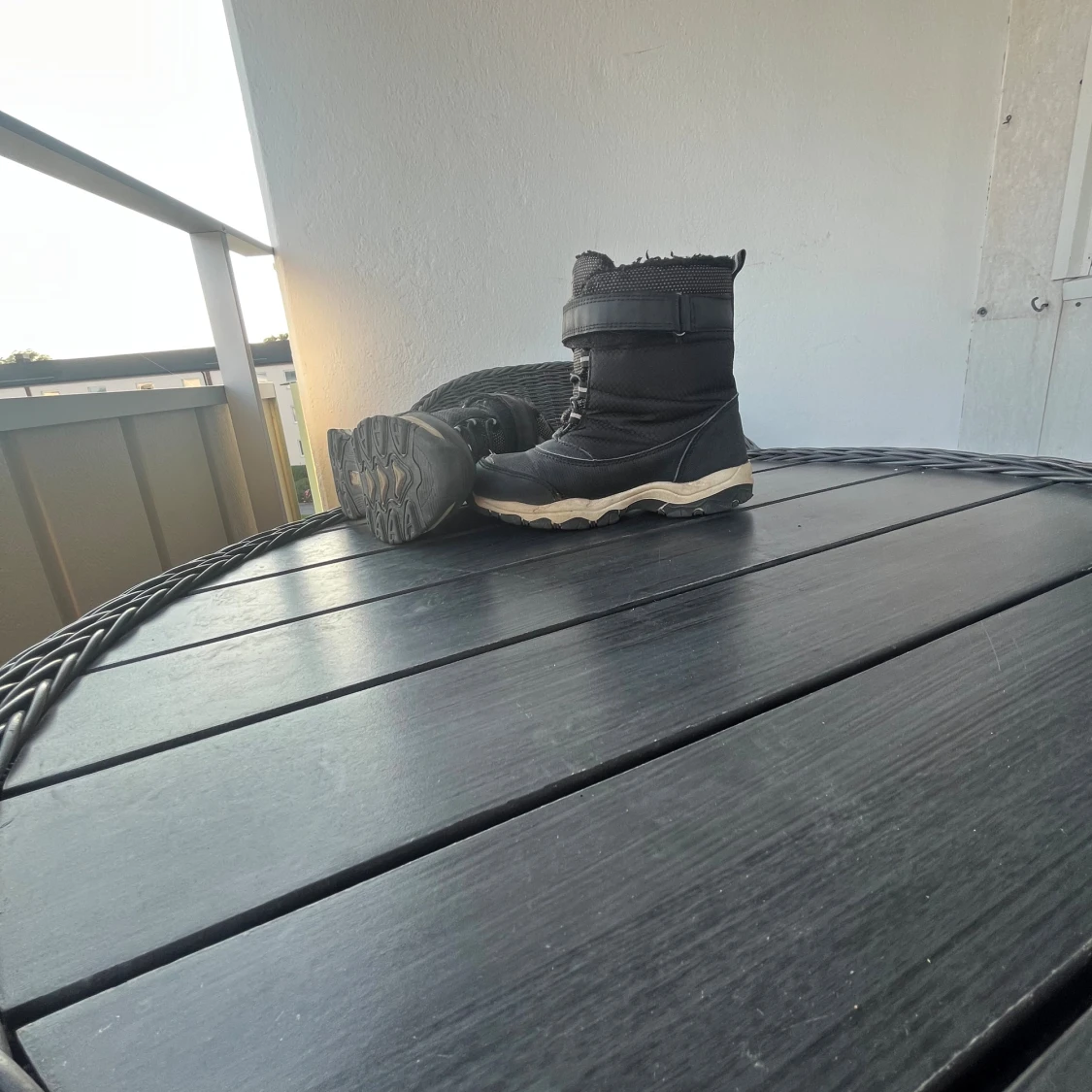 Svarta vinterstövlar med grov sula och snörning framtill. Insidan är fodrad med mjukt material för extra värme. Stövlarna har kardborreband upptill och är perfekta för kalla dagar. Snygg och praktisk design med slitstark syntet och textil.