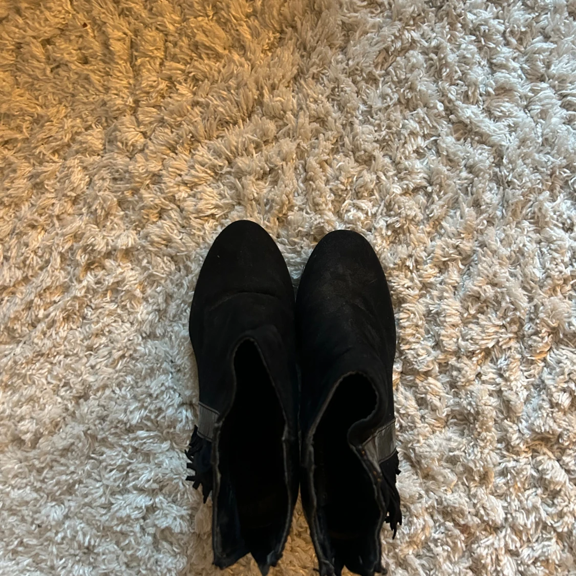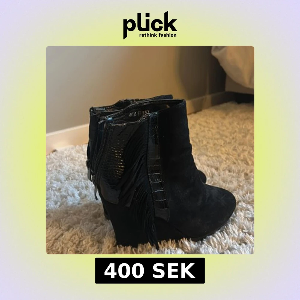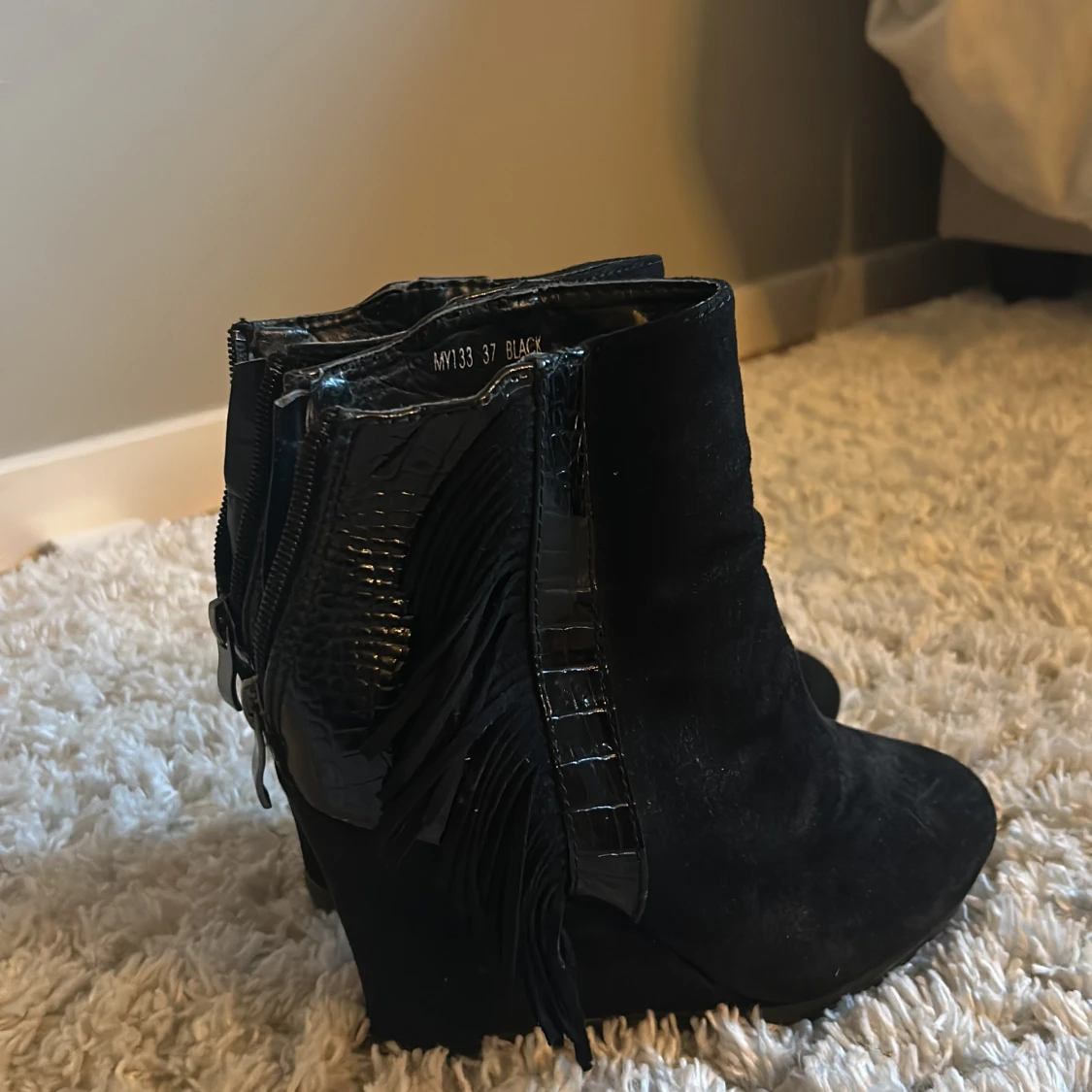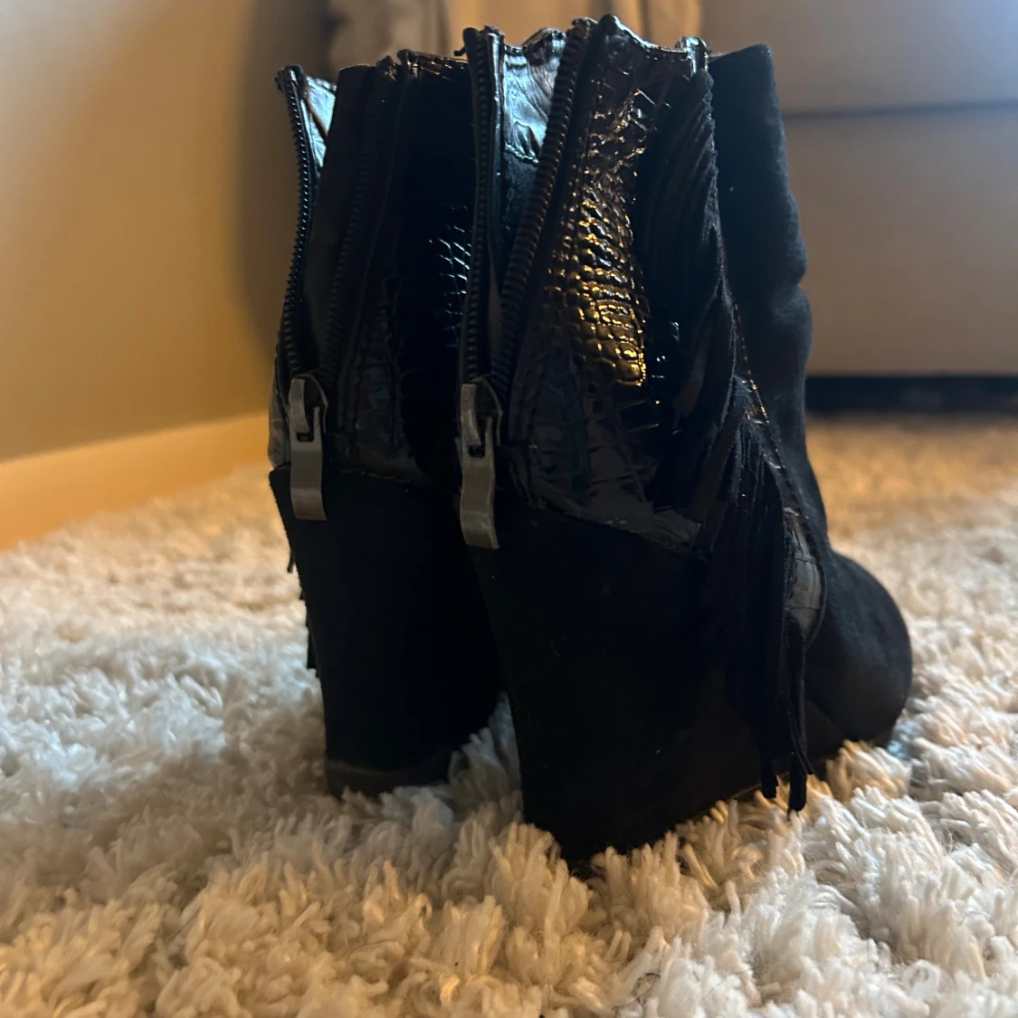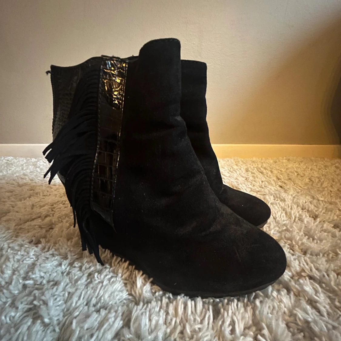 Säljer ett par svarta boots med snygga fransar på sidorna och croc-mönstrade detaljer i glansigt material. Skorna har dragkedja bak och är i mocka-look med rund tå och klack. Perfekta för dig som vill sticka ut lite extra.
