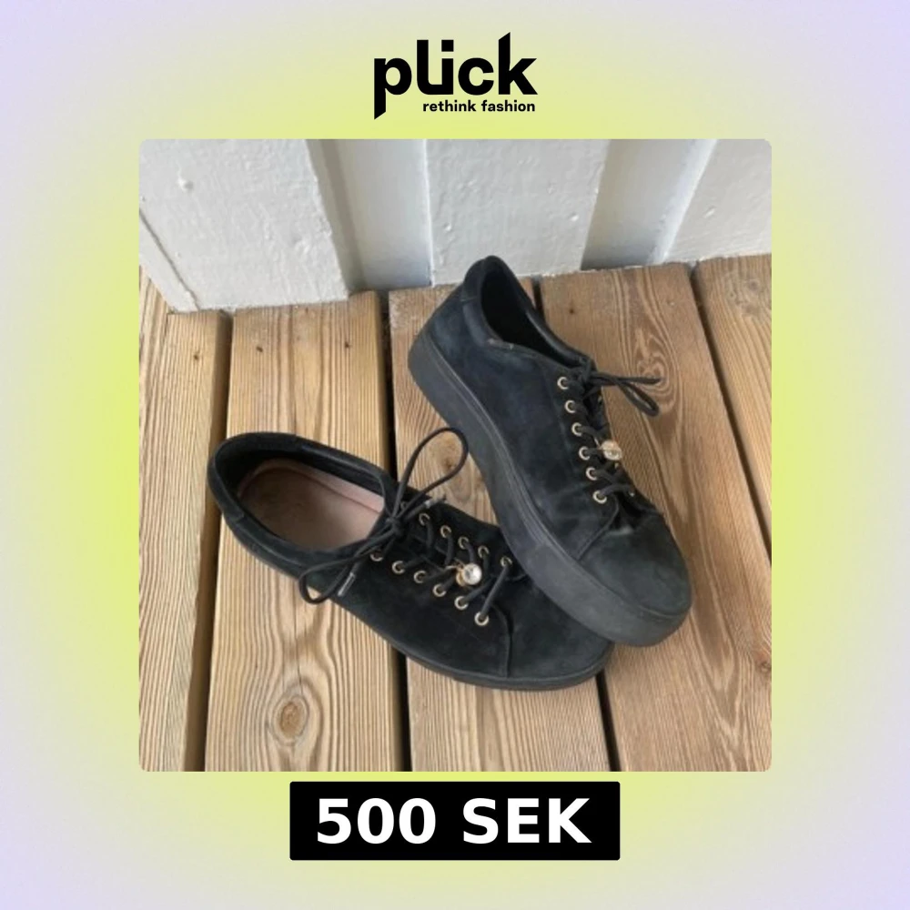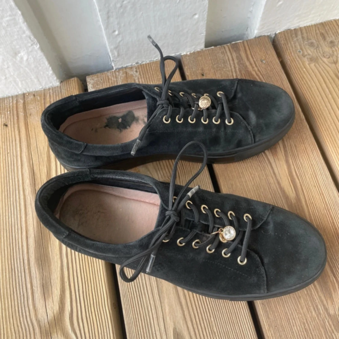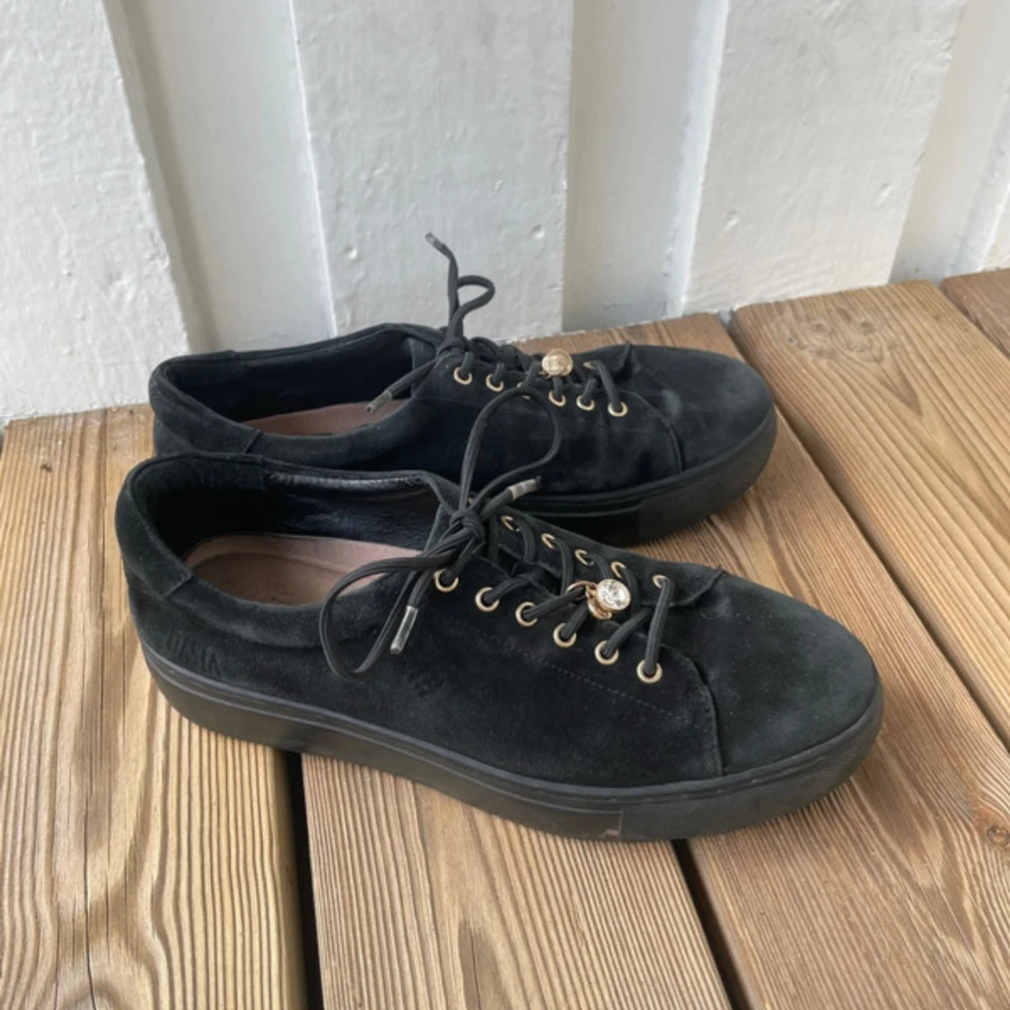 Snygga svarta sneakers från Dasia i mjuk mocka med platt sula och rund tå. Skorna har guldfärgade öljetter och snörning med en dekorativ pärldetalj på snöret. Perfekta för dig som gillar stilrena och coola skor med lite extra bling.