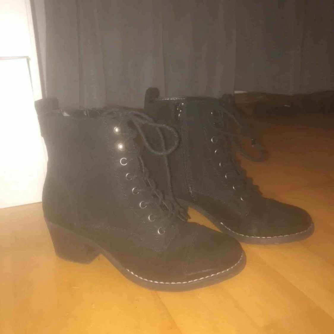 Skor från deichmann. Storlek 37, sitter som 37,5 då jag har 38 i de flesta skorna. Svarta skosnören och svart mocka (vet inte om den är äkta). Inte speciellt hög klack och sitter väldigt bra format efter foten. Ett väldigt bra skick, ej sönder.