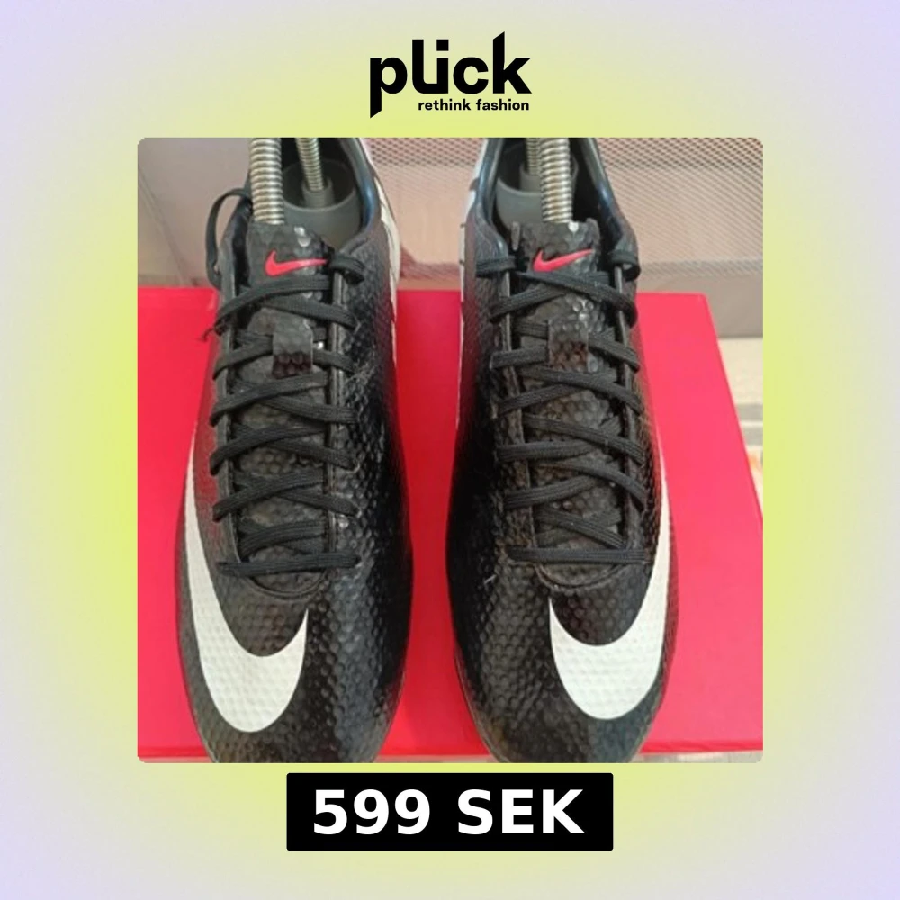 Svarta Nike Mercurial fotbollsskor med vit swoosh och stora vita NIKE-bokstäver på hälen. Skorna har snörning, texturerad syntetisk ovandel och röda dobbar. Perfekta för dig som vill sticka ut på planen med stilren och sportig look.