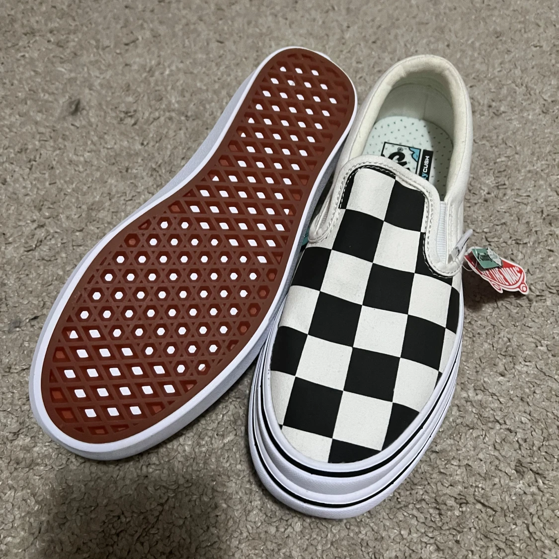 Snygga slip-on sneakers från Vans med klassiskt svartvitt rutmönster. Skorna har en bekväm ComfyCush-sula och är perfekta för en avslappnad stil. Den ikoniska designen gör dem till ett måste i garderoben. Helt nya oanvända med etikett på