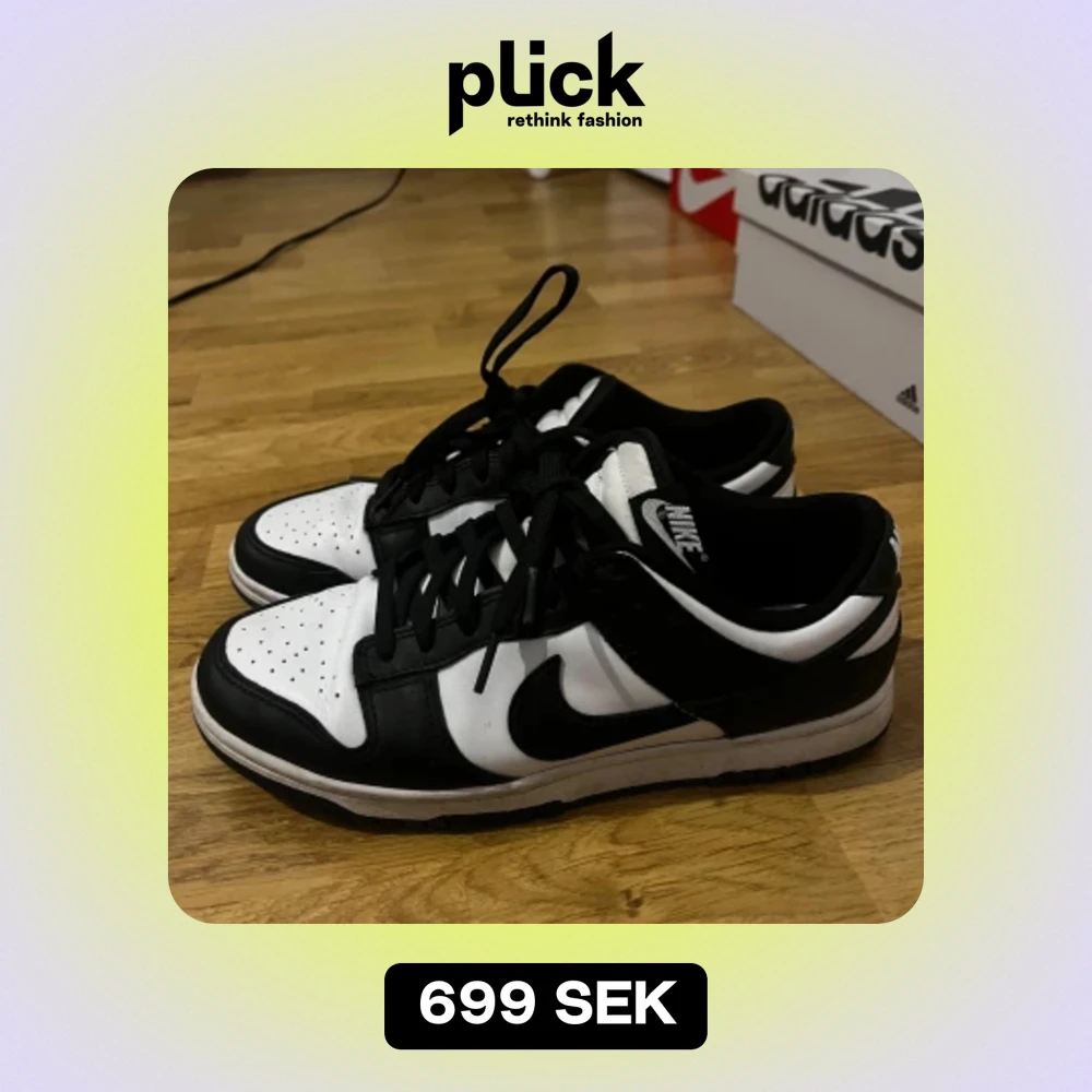 Ett par panda dunk från Nike med snörning. Skorna har en vit bas med svarta detaljer och Nike-logotypen på sidan och hälen.