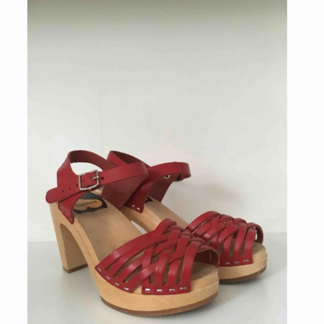 Swedish hasbeens skyhigh. Röda träskor i storlek 35. Endast använda ett par ggr inomhus. Hämtas i Hammarbyhöjden. Köpare står för frakten.