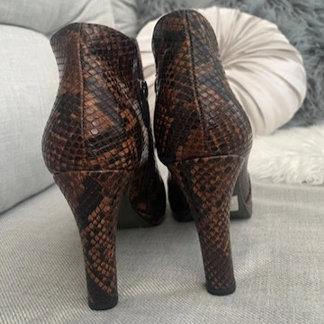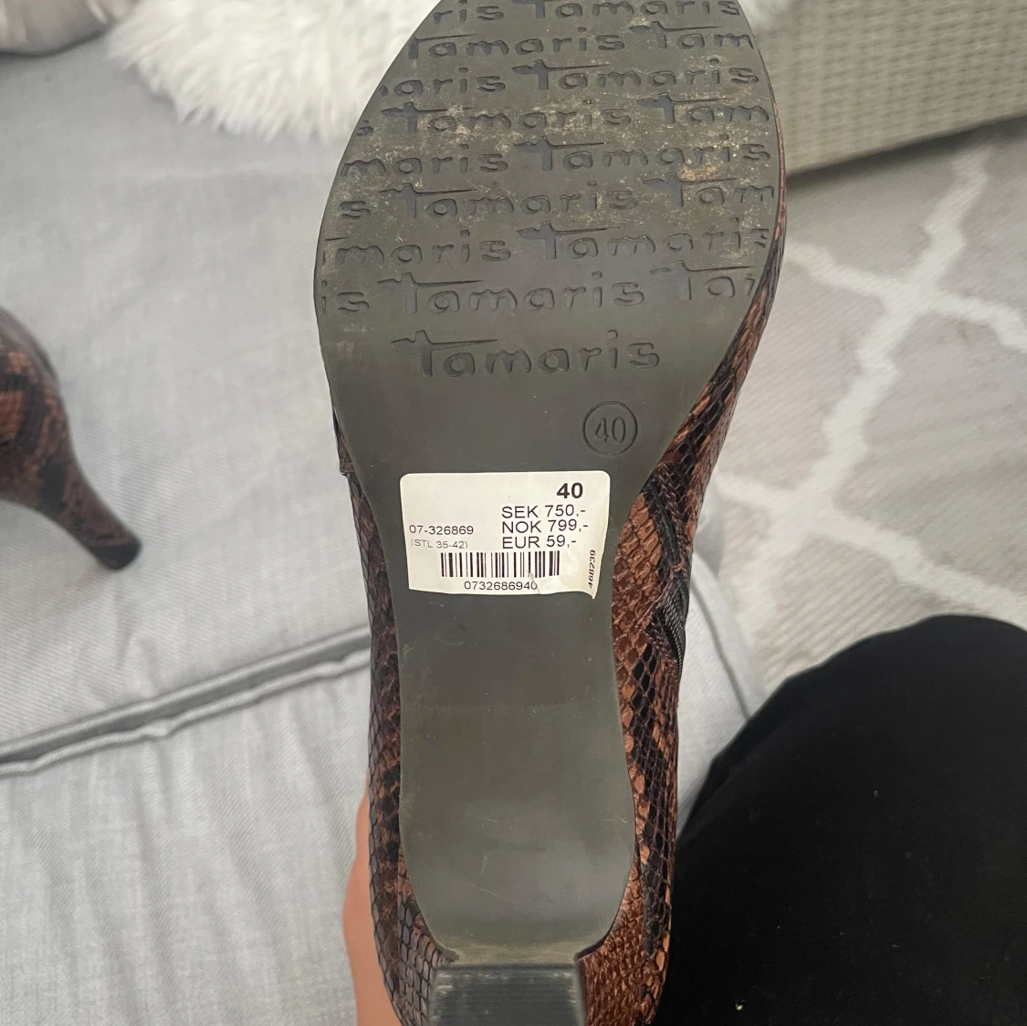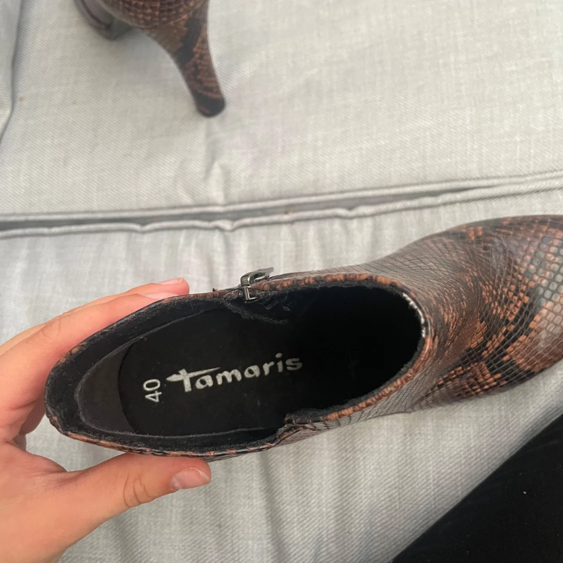 Snygga stövletter från Tamaris i storlek 40 med brunt ormskinnsmönster och hög klack. Skorna har dragkedja på sidan och är tillverkade i syntetmaterial med en cool struktur. Perfekta för dig som vill sticka ut med ett djurmönstrat statement.