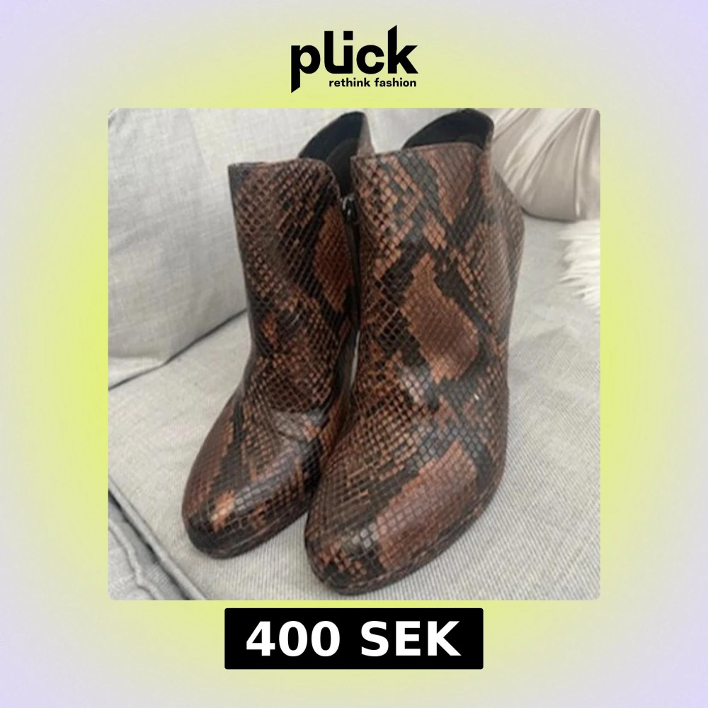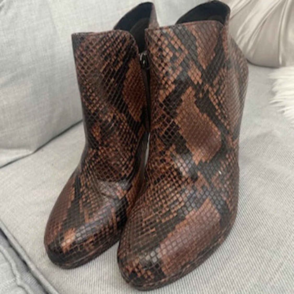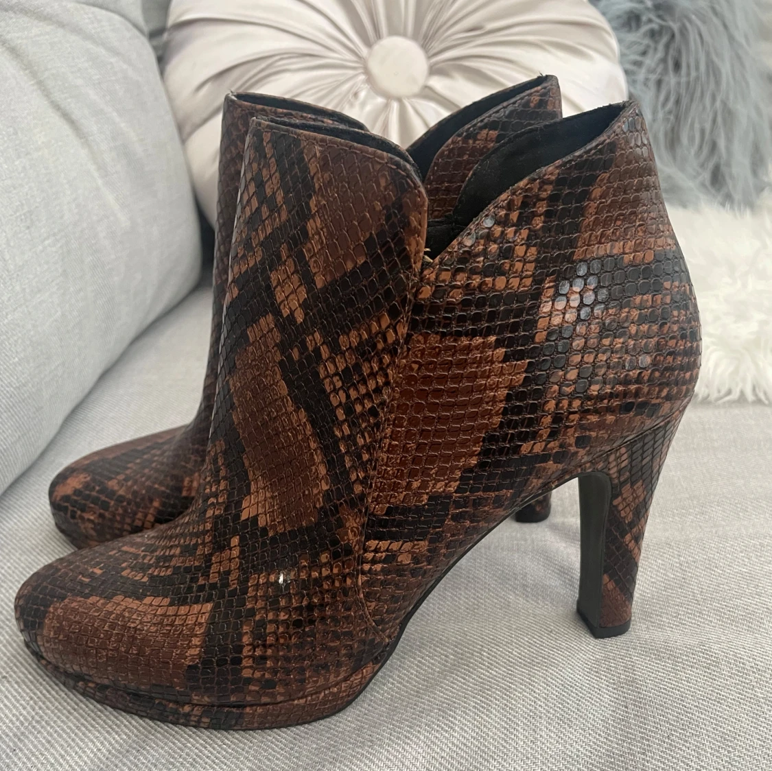 Snygga stövletter från Tamaris i storlek 40 med brunt ormskinnsmönster och hög klack. Skorna har dragkedja på sidan och är tillverkade i syntetmaterial med en cool struktur. Perfekta för dig som vill sticka ut med ett djurmönstrat statement.