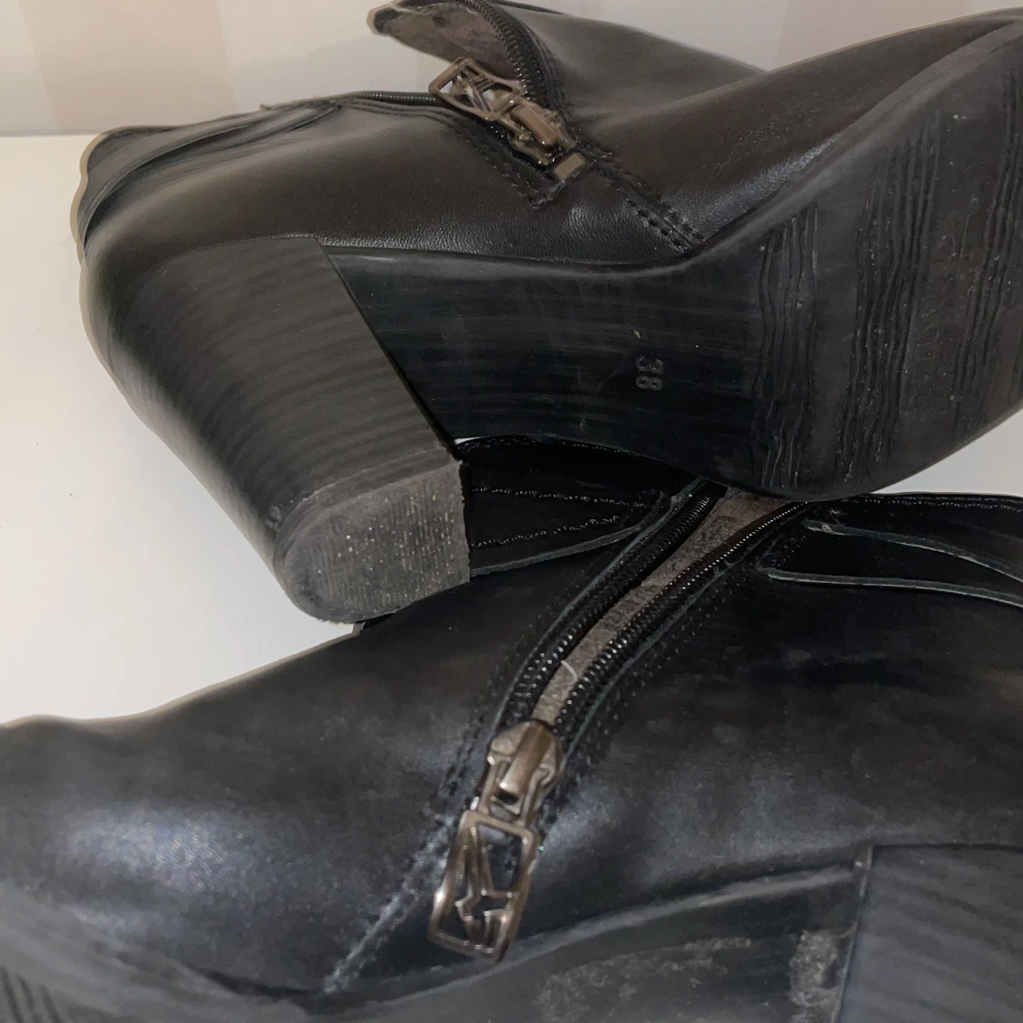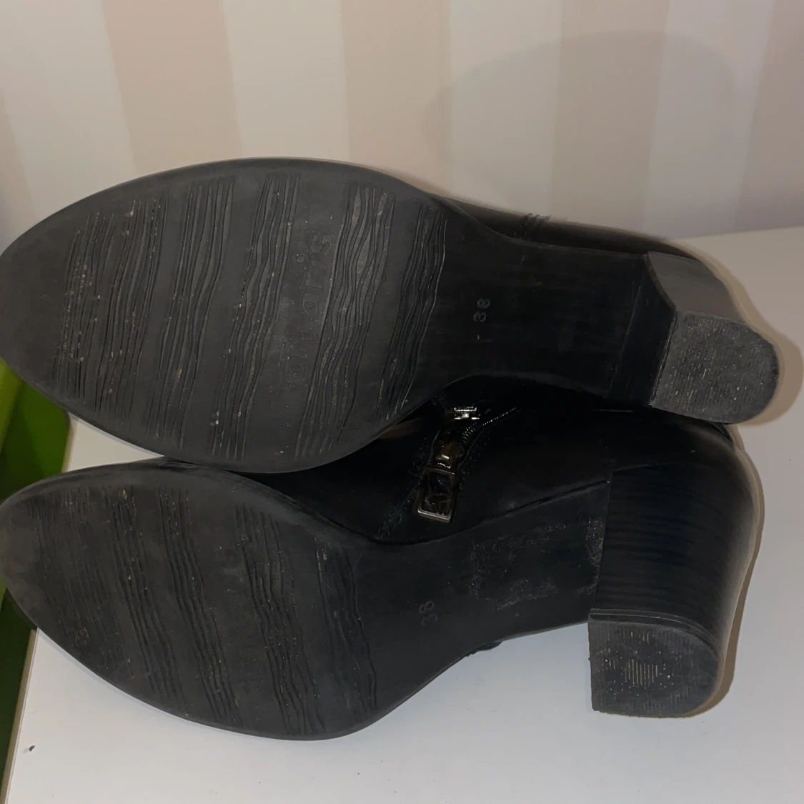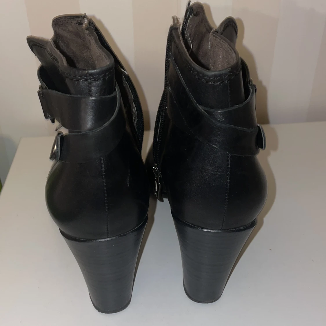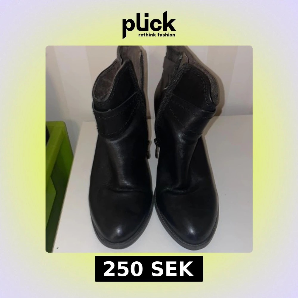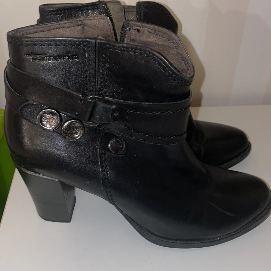 Snygga svarta boots från Tamaris med klack och dekorativa spännen knappt använda. Skorna har en praktisk dragkedja på sidan för enkel på- och avtagning. Perfekta för en stilren look.