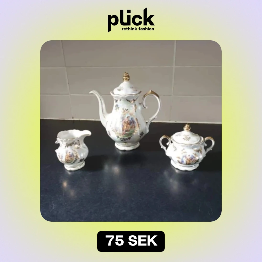 Fin Te-set, med tekanna, sockerskål och mjölkkanna (som tyvärr har gått sönder, örat är trasigt)