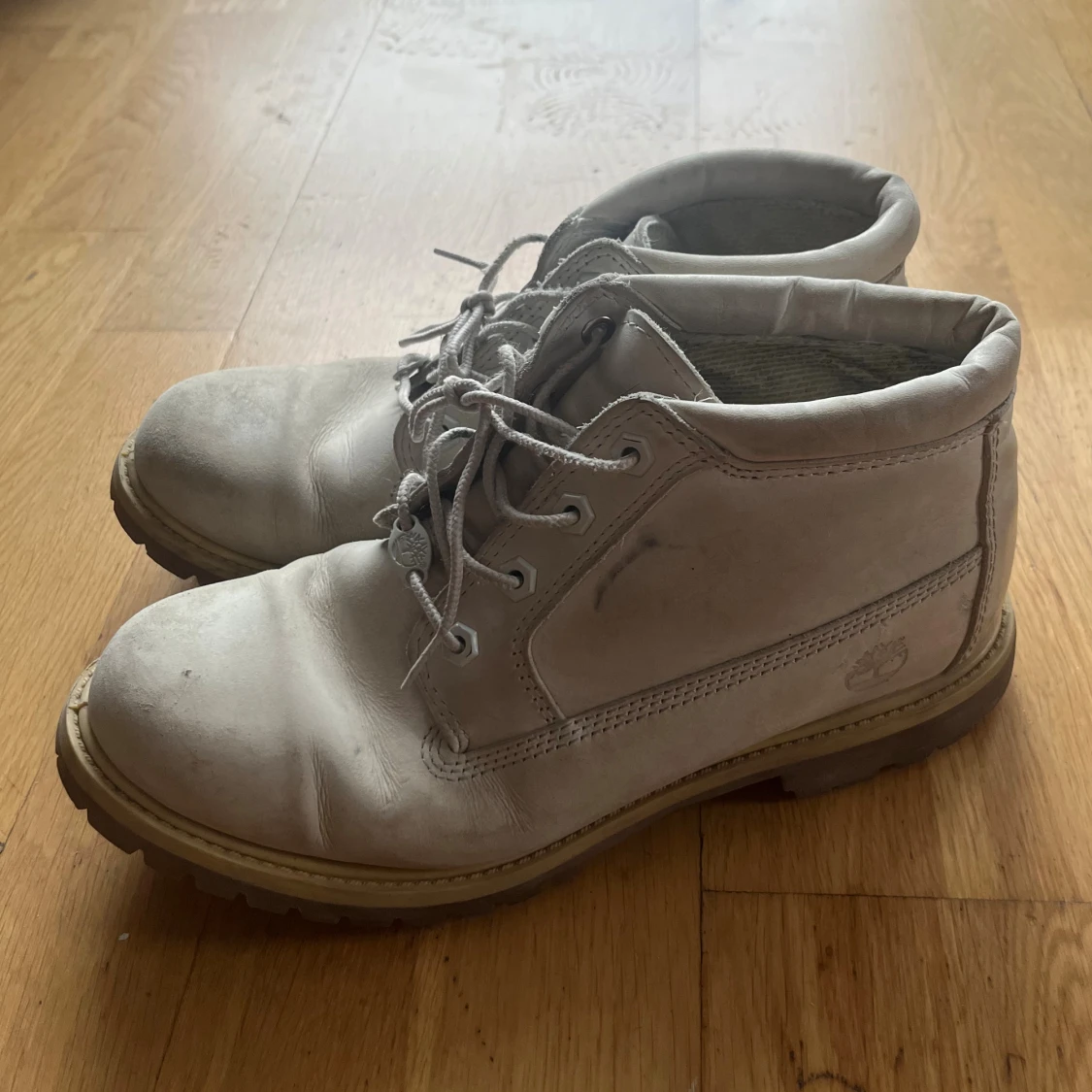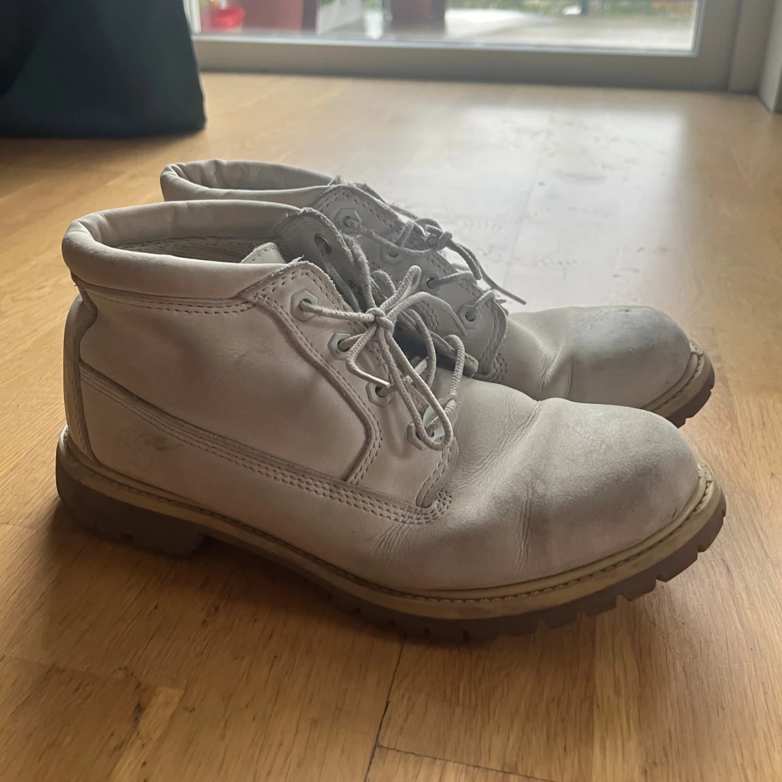 Säljer ett par klassiska Timberland boots i beige nubuck med grov sula och snörning. Skorna har rund tå och robust design, perfekta för dig som gillar street och outdoor-vibe. Timberland-loggan syns på sidan. Nubuck cleaner medföljer vid extra 100 lapp. Mer information, photos och prisdiskutering i dm.