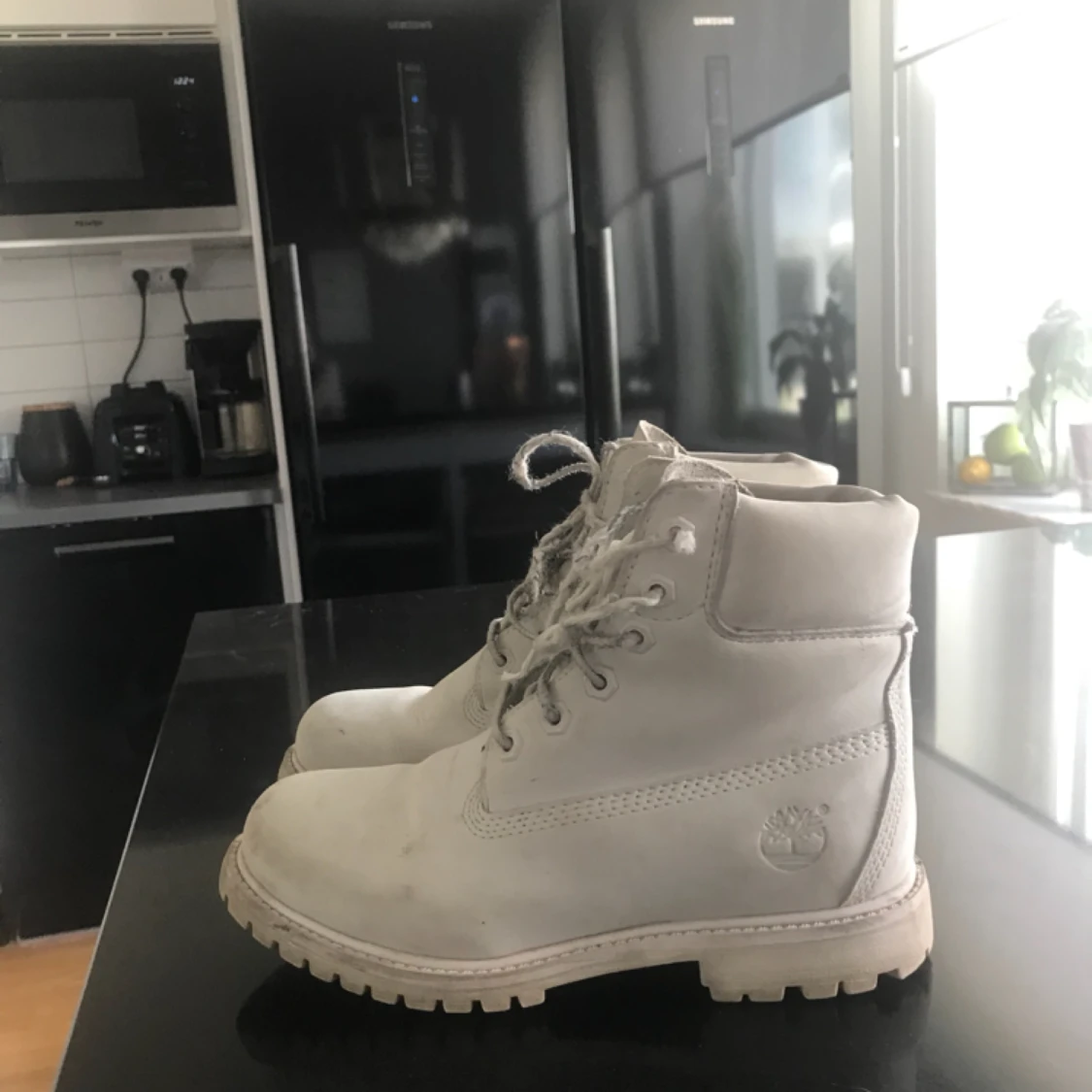 Vita timberlands i fint skick förutom sliten snörning. Kostar ca 1500 nya.