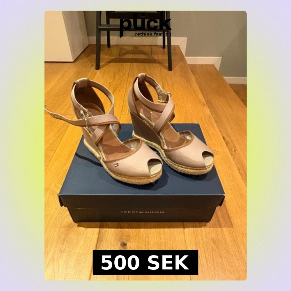 Snygga beige Damskor från Tommy Hilfiger med kilklack och öppen tå. Skorna har korsade remmar med spänne runt ankeln och en plattform i repmaterial. Tillverkade i textil och skinn, perfekta för vår och sommar. Diskret logga på sidan för extra stil.
