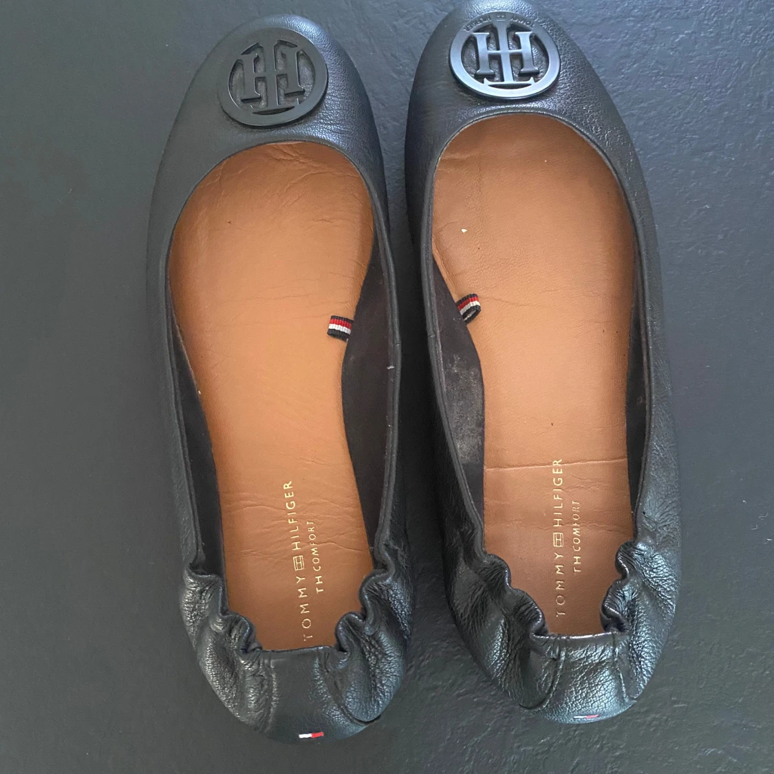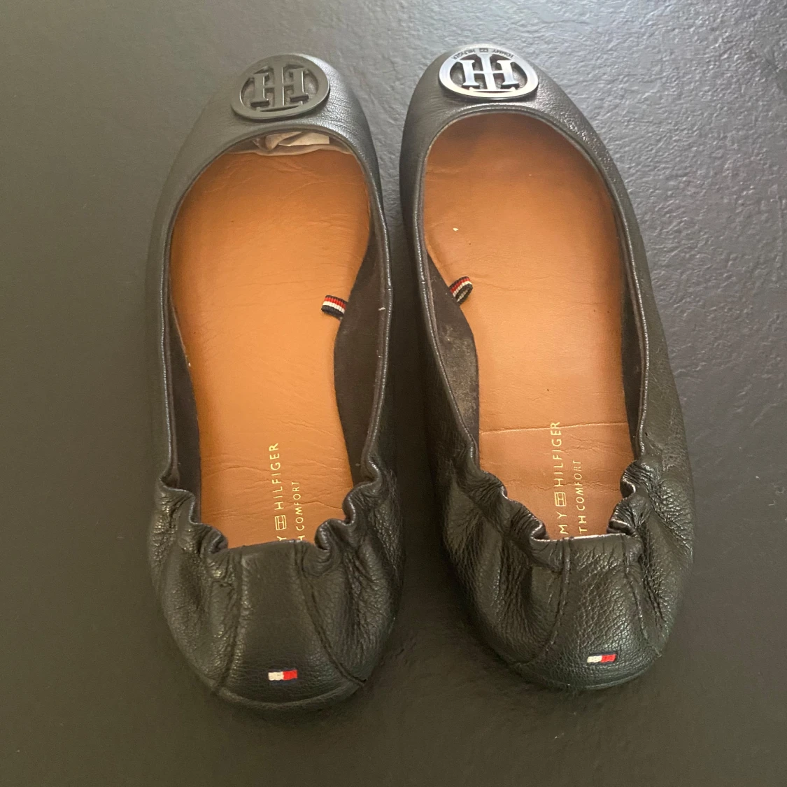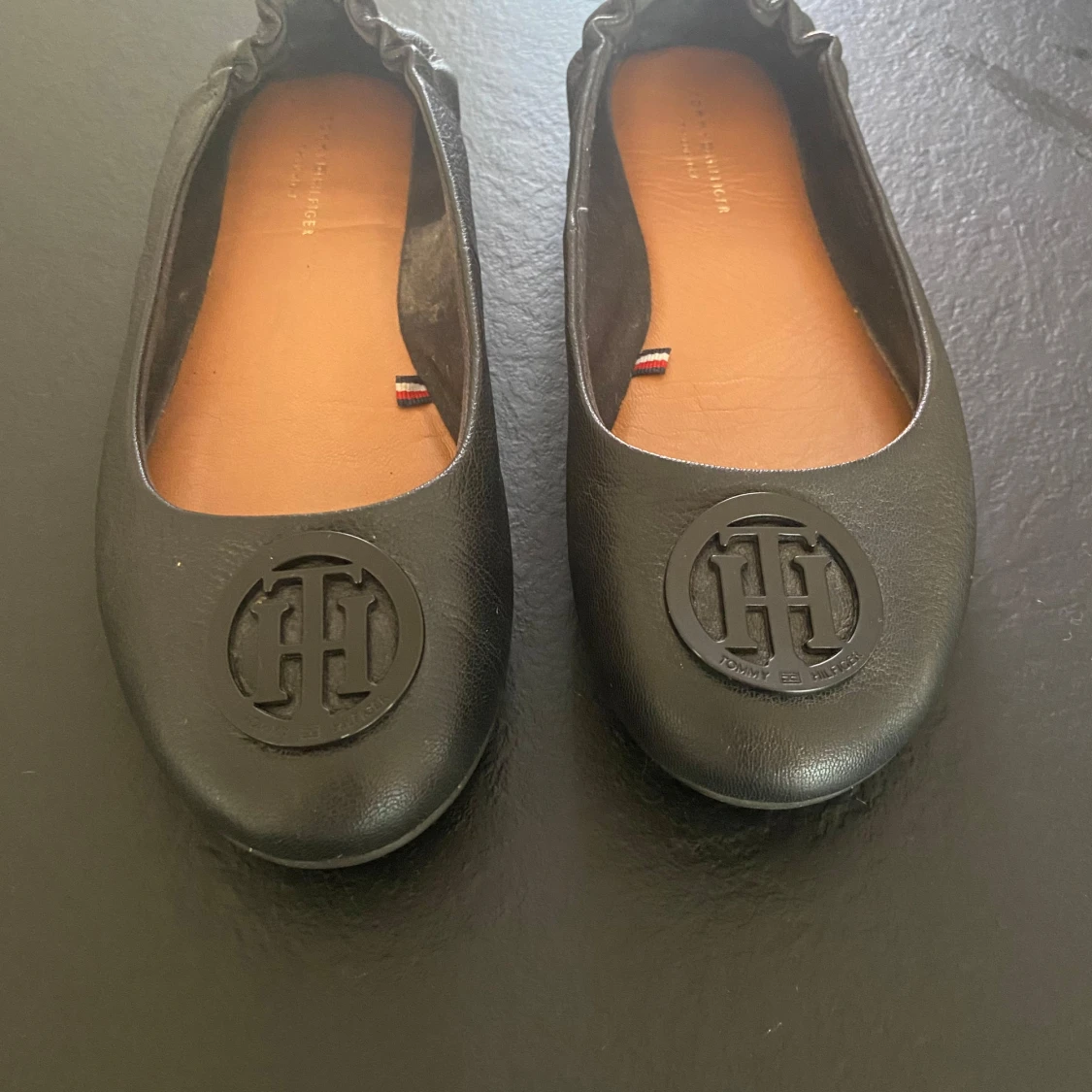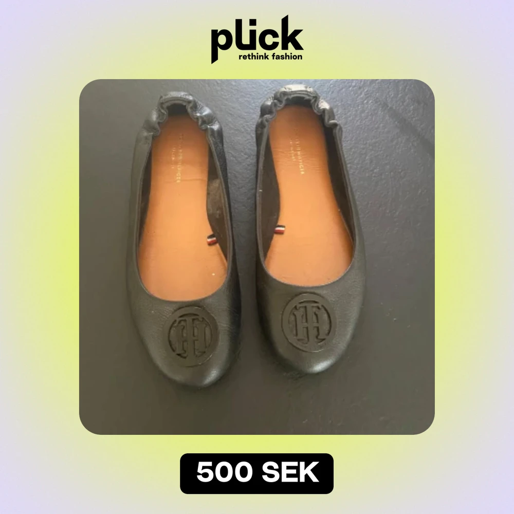 Säljer ett par snygga svarta ballerinaskor från Tommy Hilfiger i nyskick. De är gjorda i skinn och har en rund tå med det klassiska TH-emblemet på framsidan. Perfekta för både vardag och fest!