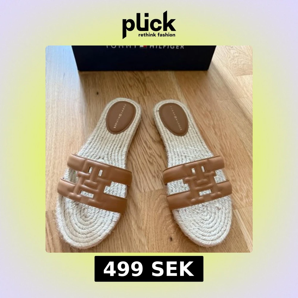 Snygga sandaler från Tommy Hilfiger med flätad beige sula och bruna remmar i skinn med TH-logga. Perfekta för sommaren med sin platta sula och stilrena design. Lätta att matcha till allt och superbekväma att glida runt i.