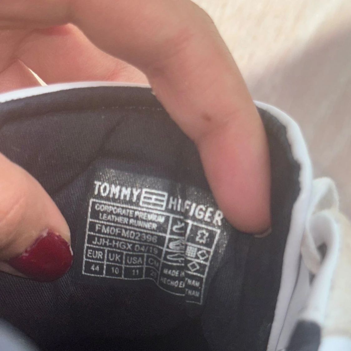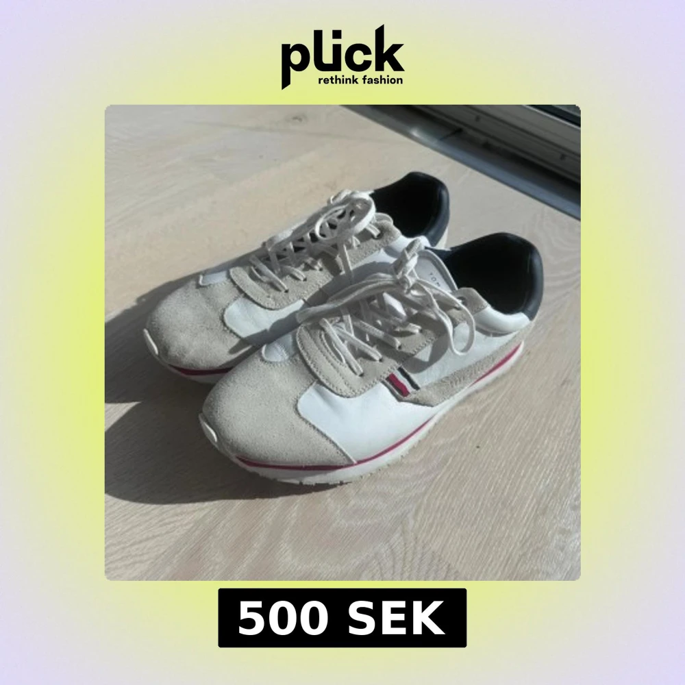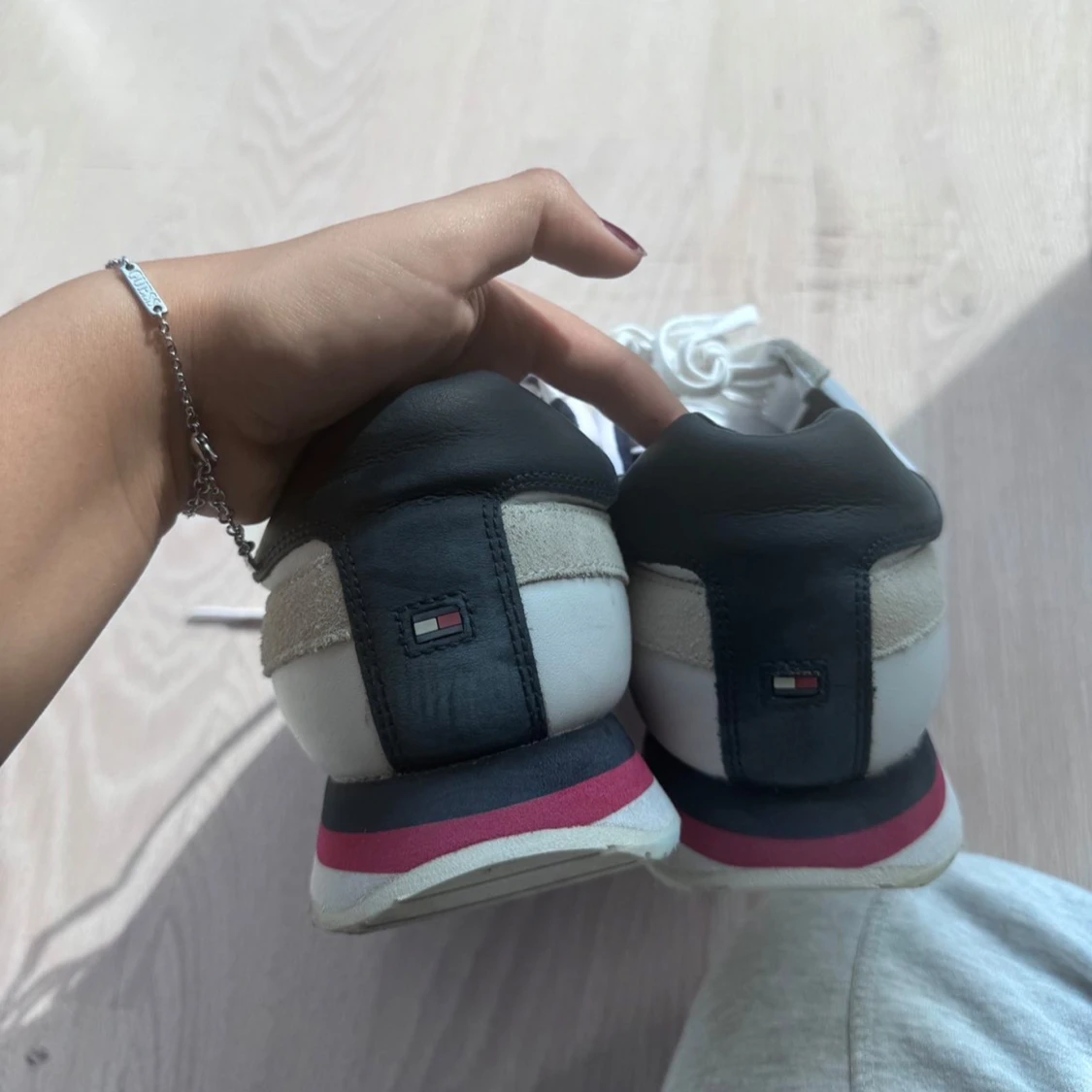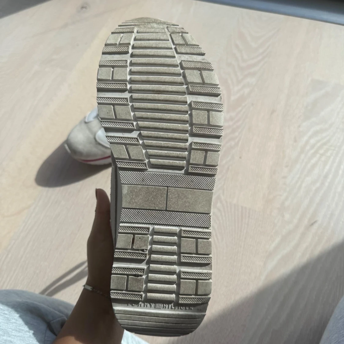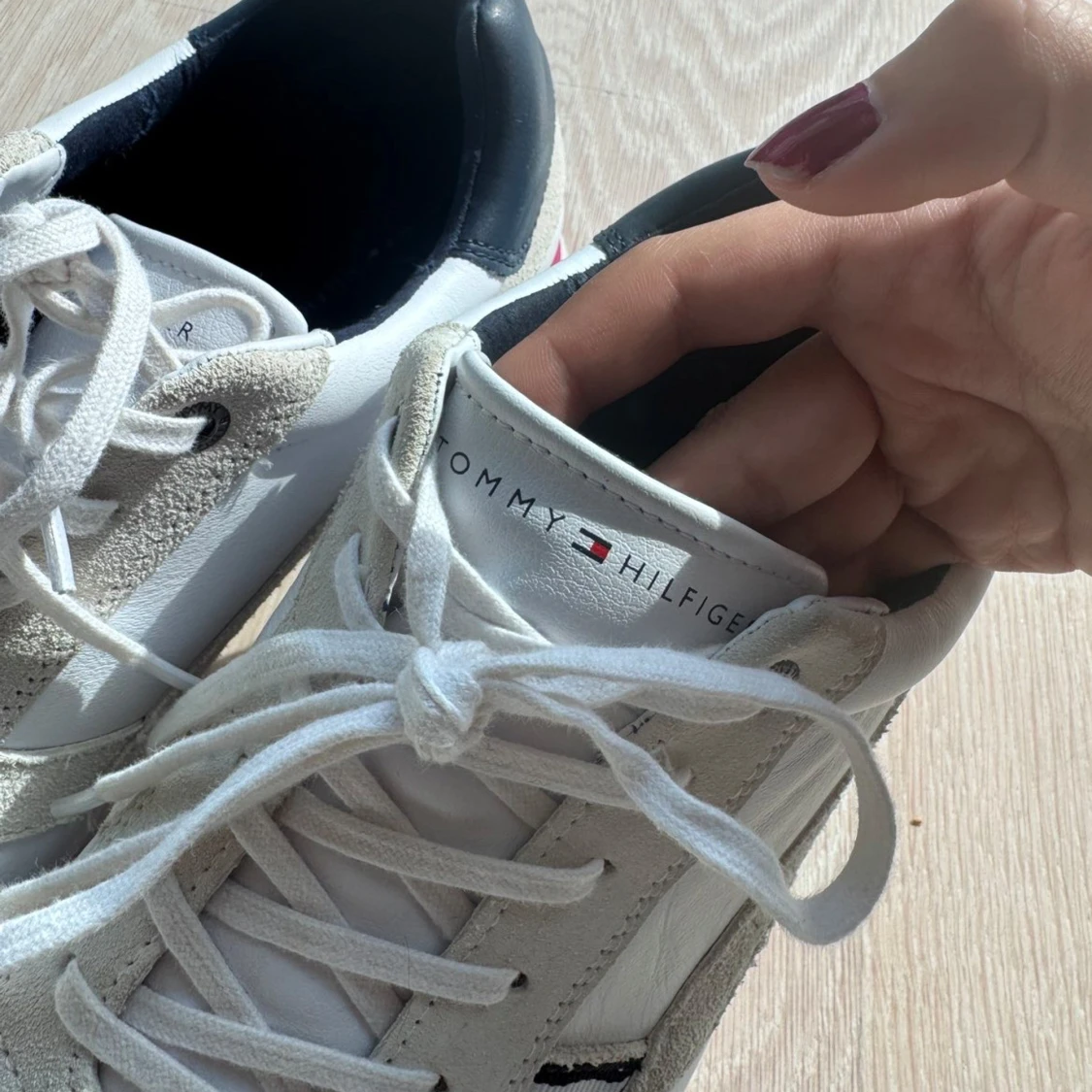 Snygga vita sneakers från Tommy Hilfiger med detaljer i beige mocka och svart häl. Skorna har snörning, röd och marinblå rand på sidan samt en robust sula. Tillverkade i skinn och mocka för en clean och sportig look. Knappast använda
