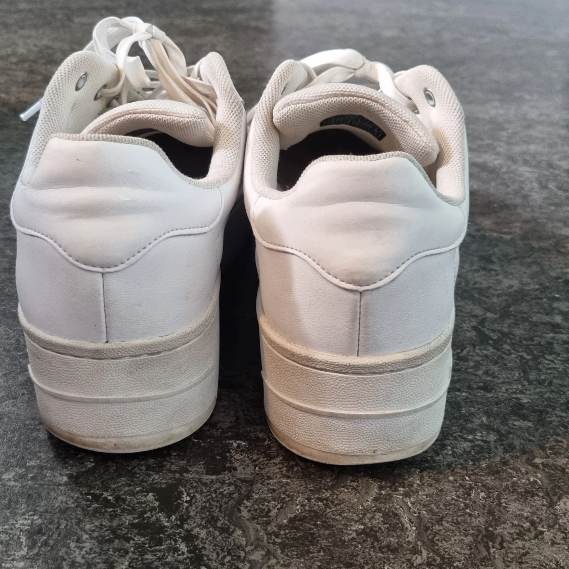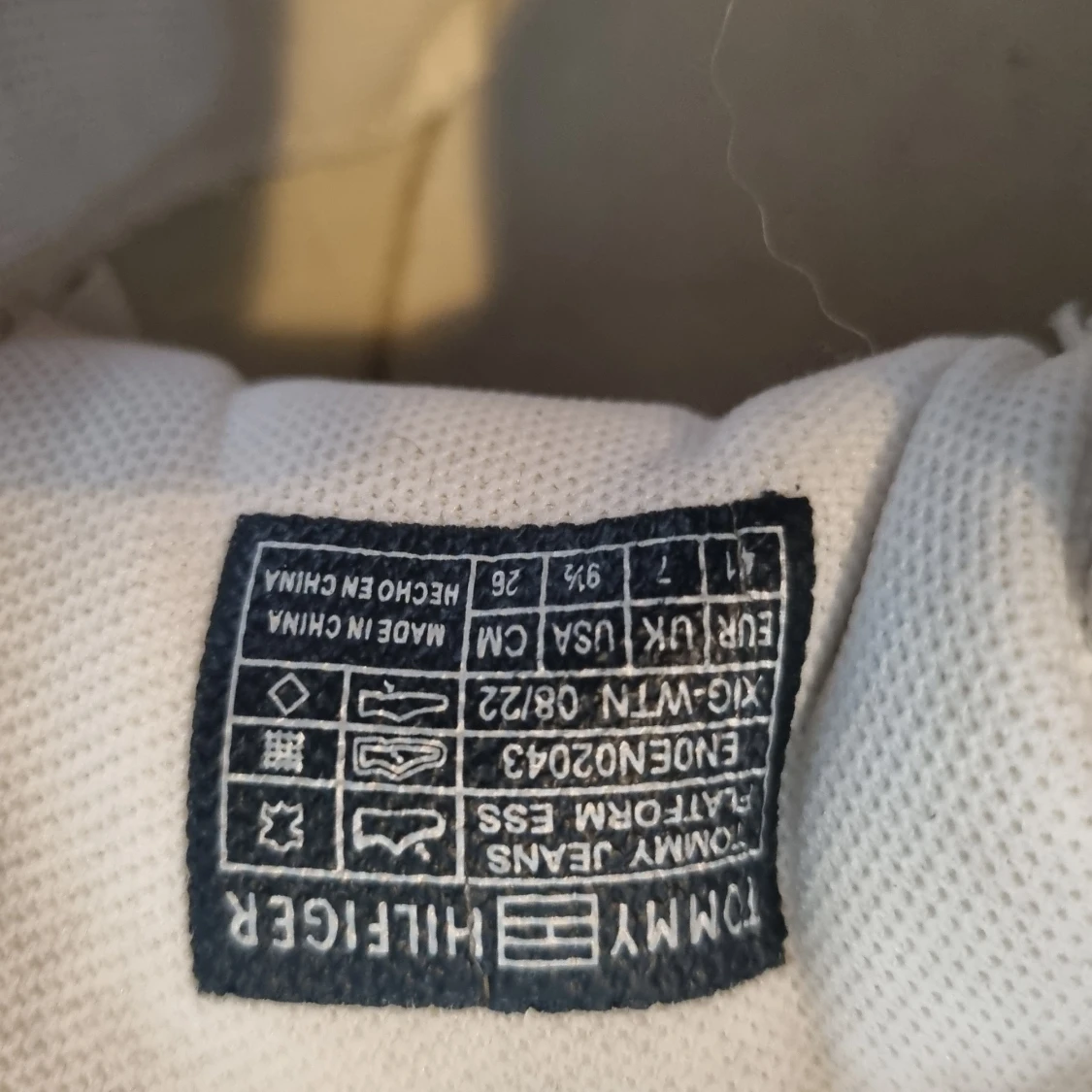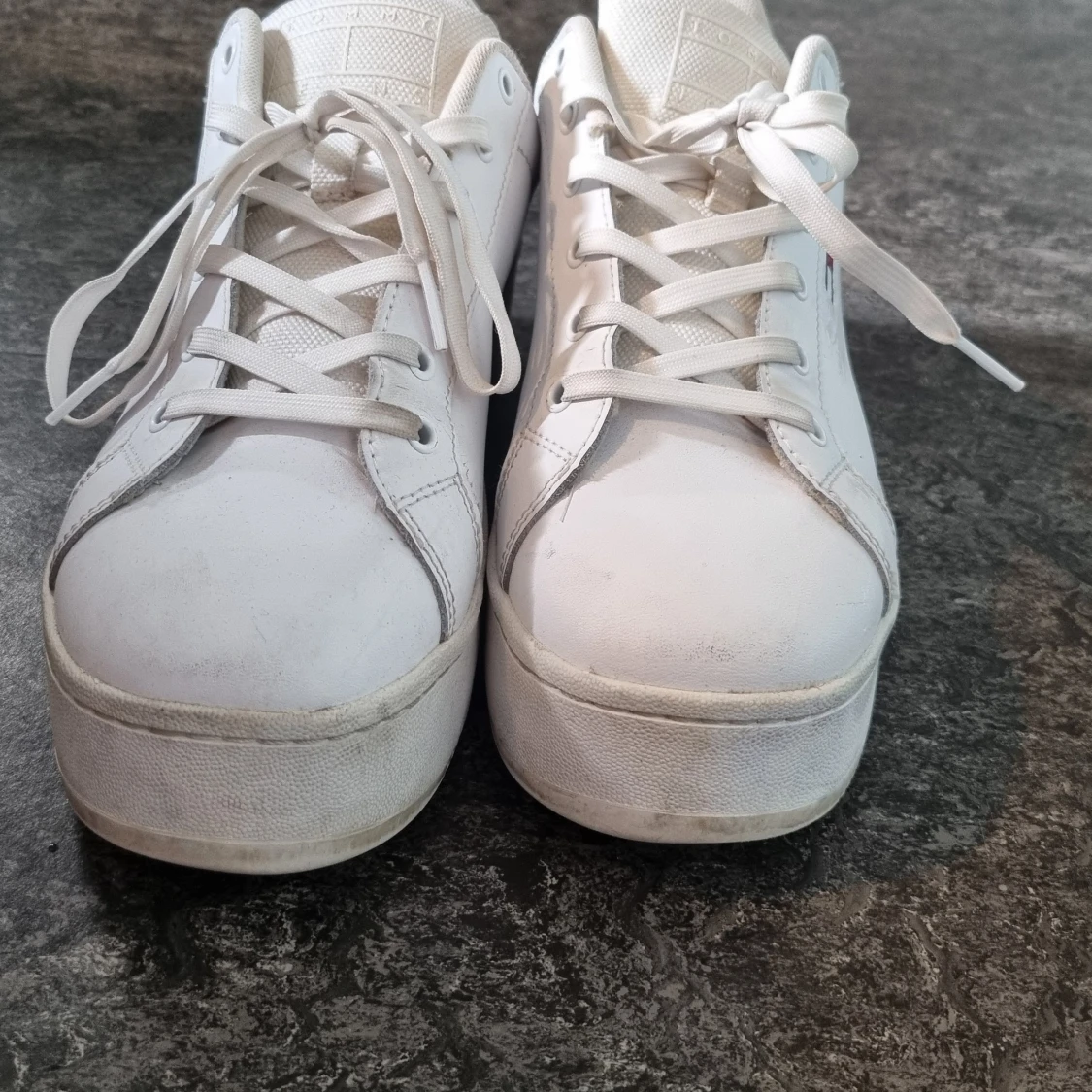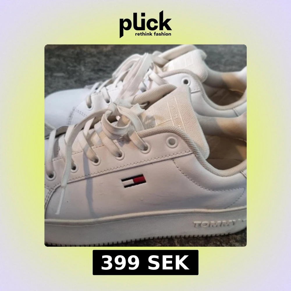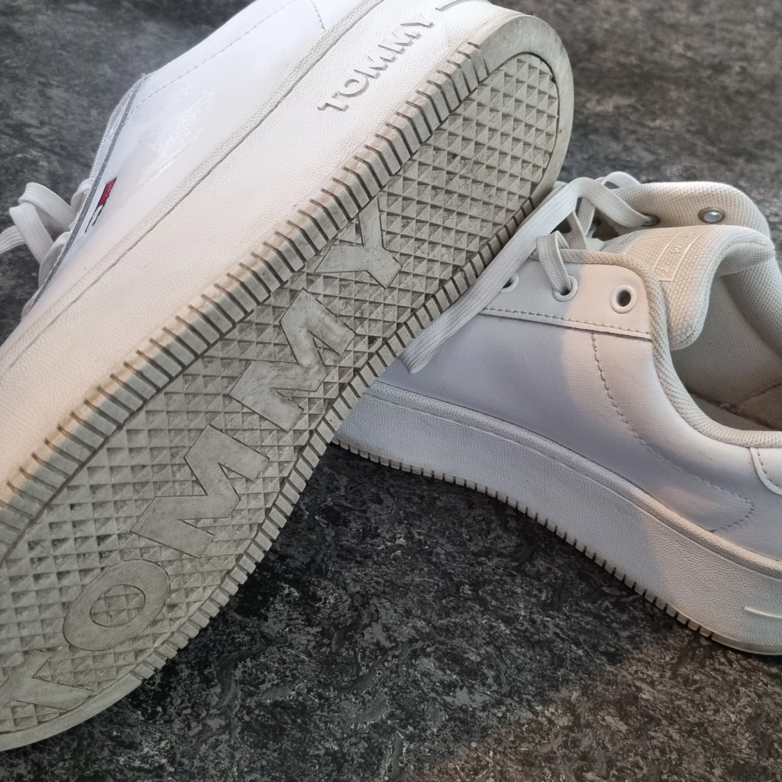 Snygga vita sneakers från Tommy Hilfiger med klassisk logga på sidan och präglad TOMMY-text på sulan. Skorna har snörning, rund tå och platt sula. Tillverkade i skinn och textil för en fräsch och stilren look. Små märken som man nog kan putsa bort. Se bilder.