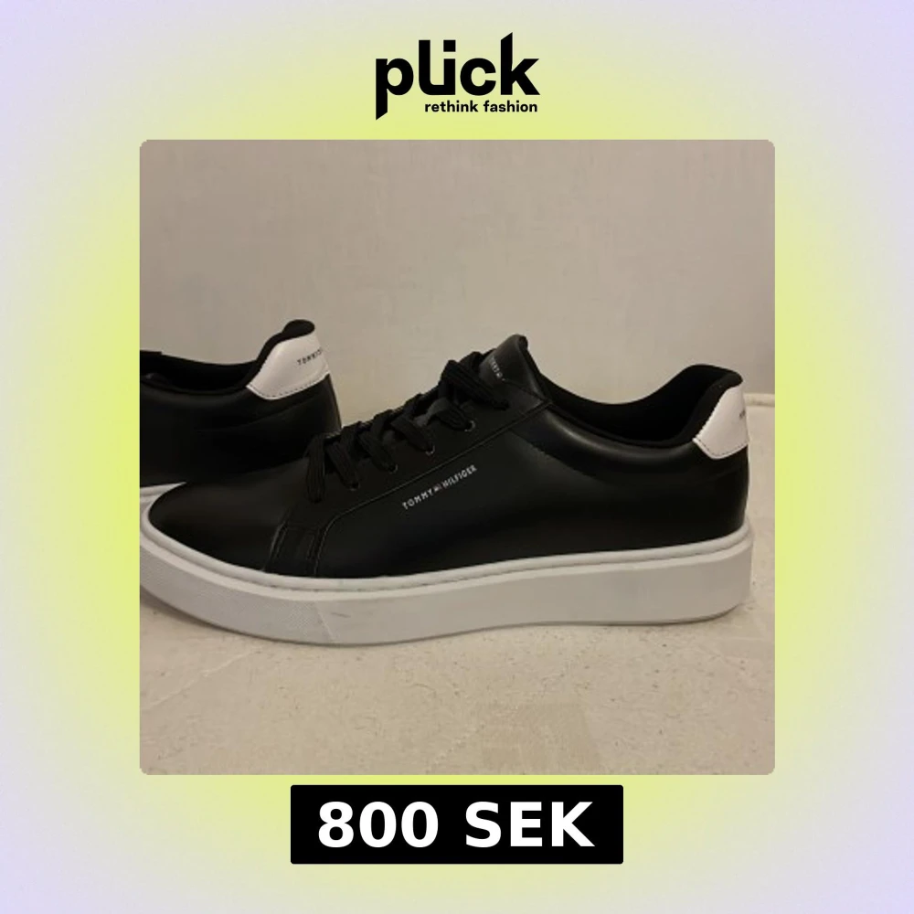 Stilrena svarta sneakers från Tommy Hilfiger med vit tjock sula och vit detalj på hälen. Skorna har snörning och är tillverkade i syntetmaterial med diskret logga på sidan och bak. Perfekta för dig som gillar en clean och modern look. Använt bara 1 gång